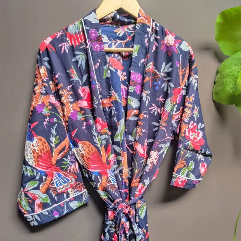 Bata Kimono con Estampado de Dibujos Animados para Mujer, de Algodón Suave y Transpirable, Camisón de Verano Hecho a Mano, ODM, Cuello en V, Cintura Elástica, Largo Completo/Hasta la Rodilla