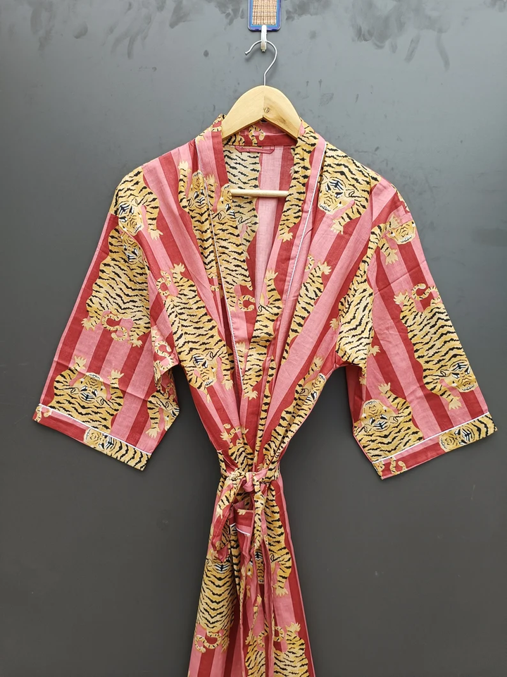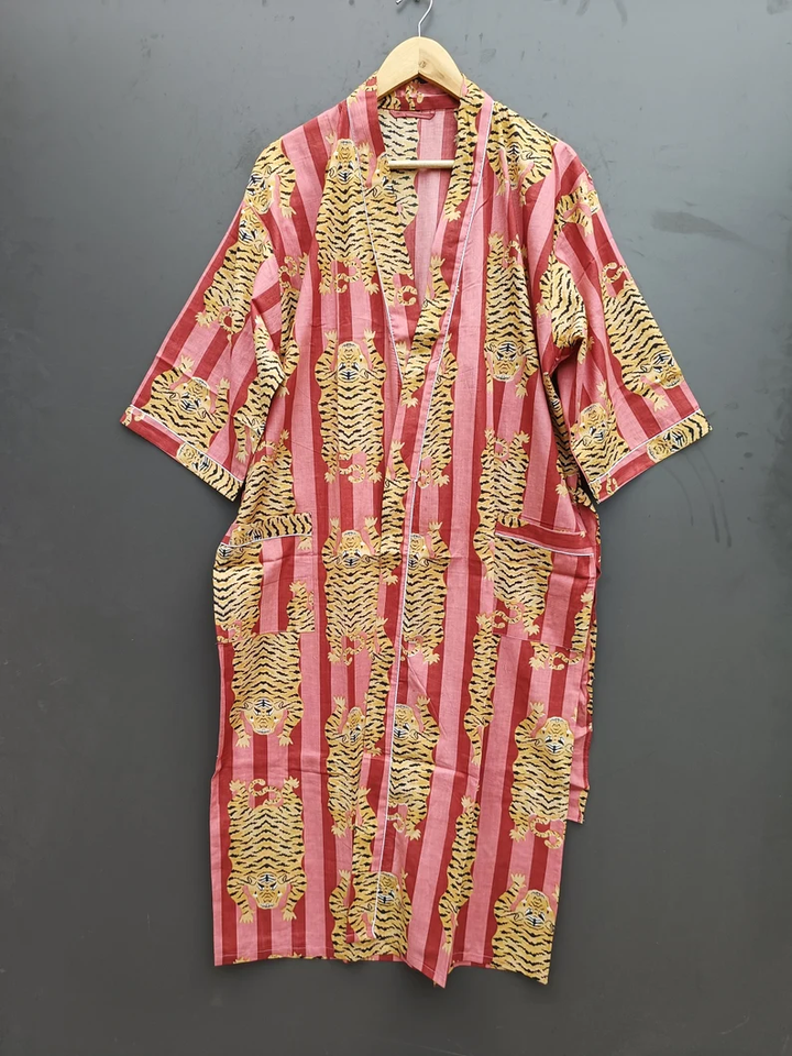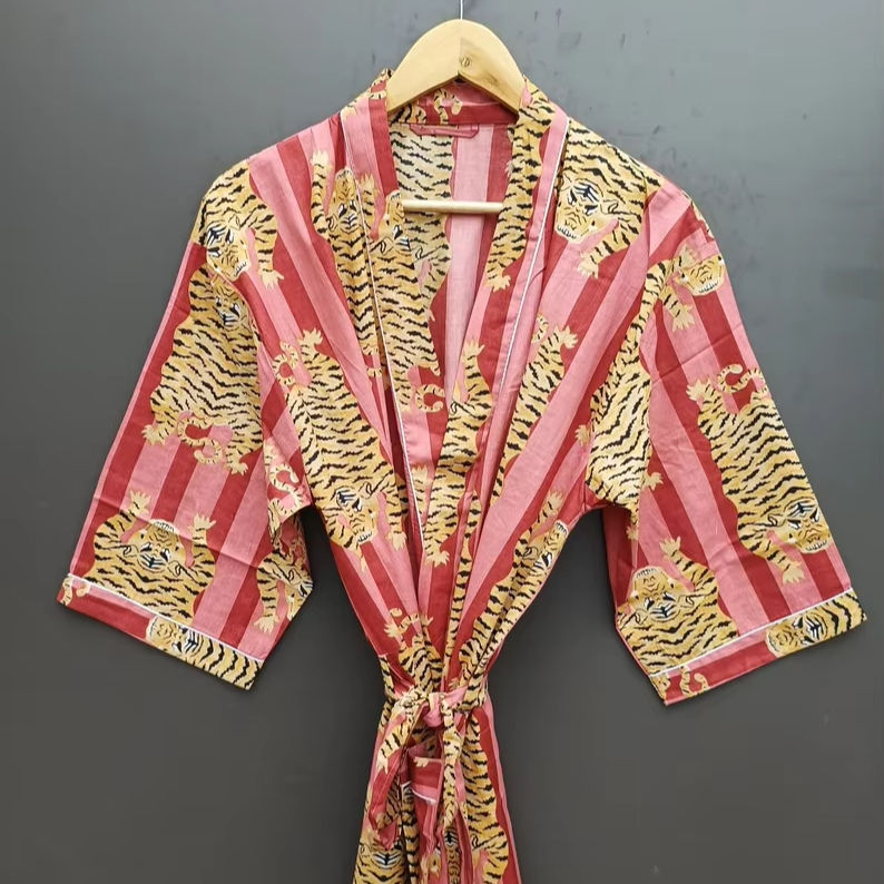 Bata Kimono con Estampado de Dibujos Animados para Mujer, 100% Algodón Transpirable, Camisón de Verano Hecho a Mano, Cuello en V, Cintura Elástica, Largo Completo