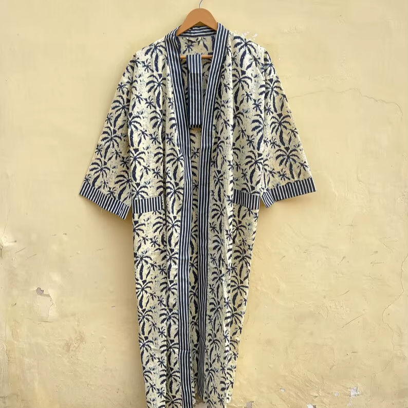 Bata Kimono de Algodón 100% Tejido con Estampado de Dibujos Animados para Mujer, Camisón de Verano Hecho a Mano, Cuello en V, Cintura Elástica, Largo Completo, Suave