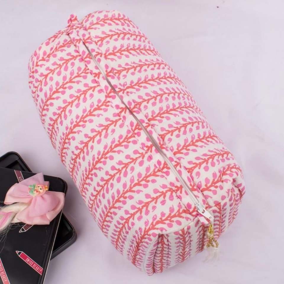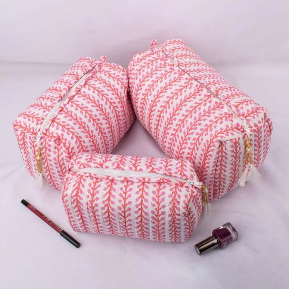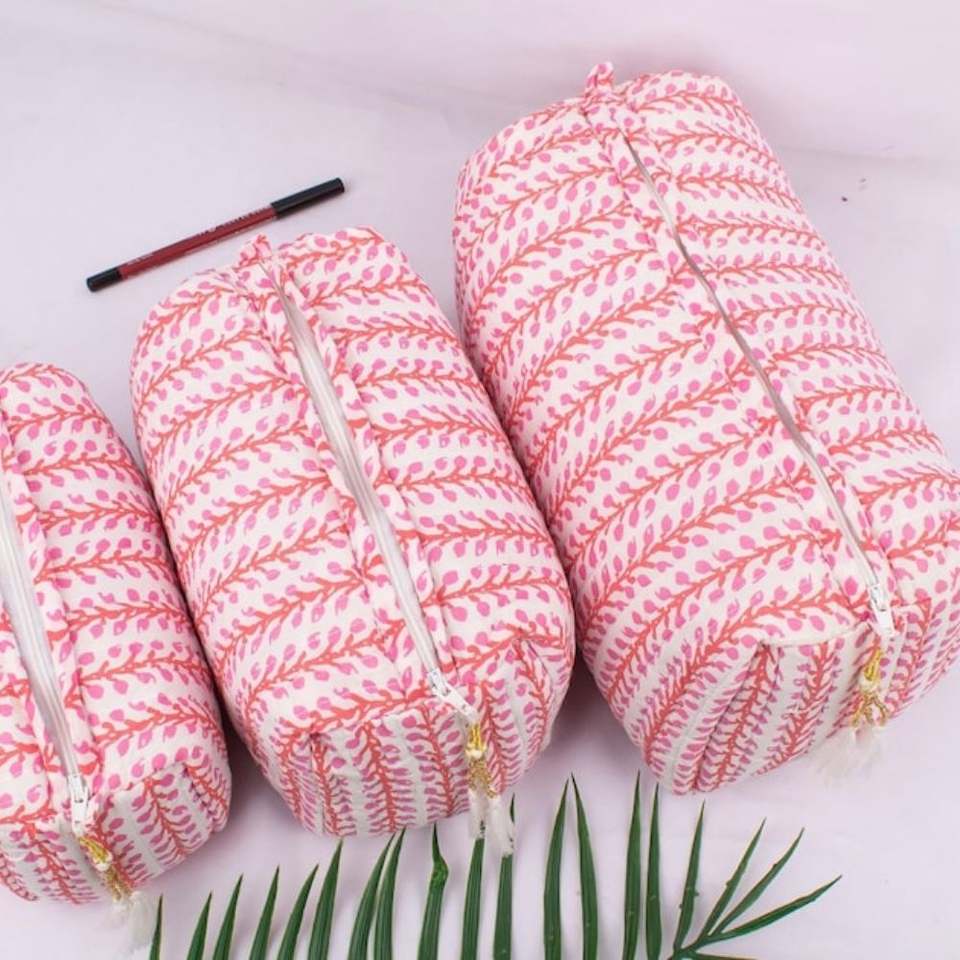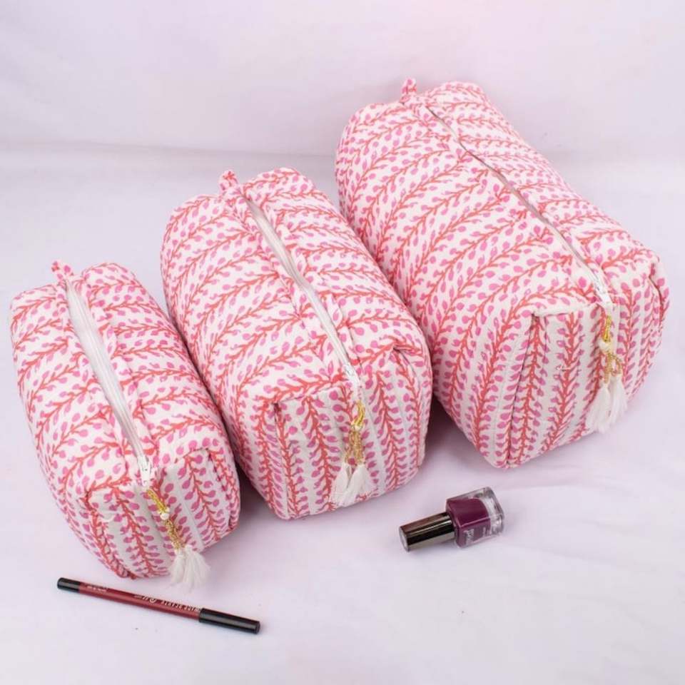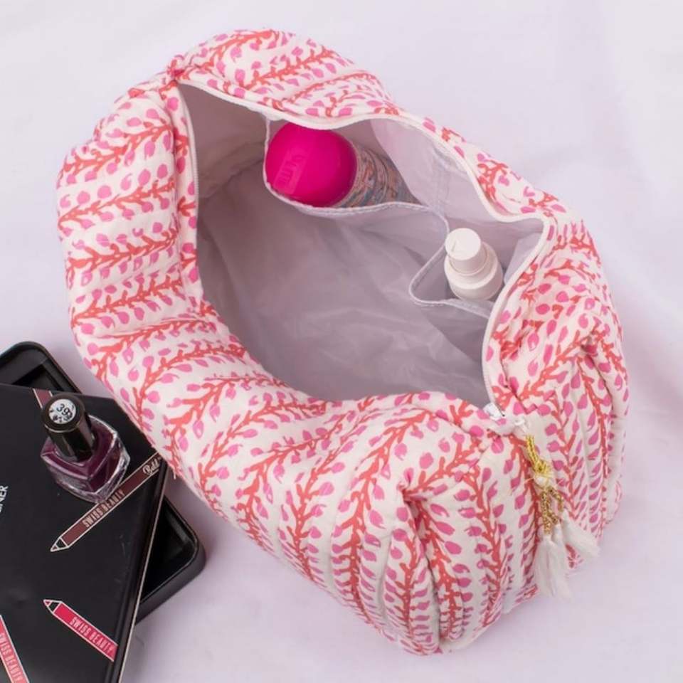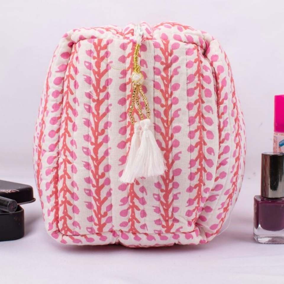 Bolsa Organizadora de Cosméticos de Algodón Acolchada, Portátil, Personalizada, de Gran Capacidad, Ligera y Ecológica, con Estampado de Bloques, Cierre y Borla