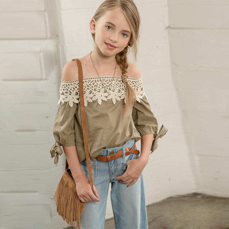 Blusa 2017 para niña, nuevo diseño de primavera, hombros descubiertos, manga 3/4 normal