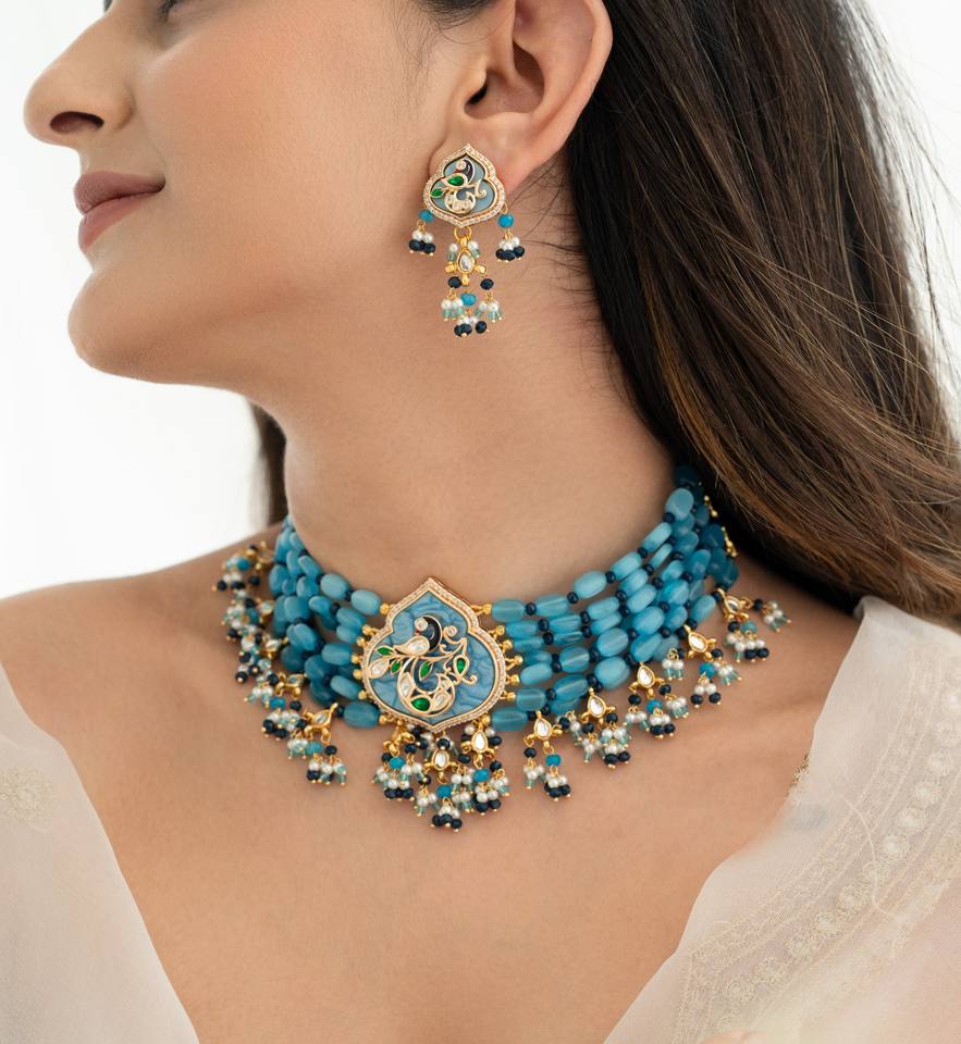 Gargantilla con cuentas chapada en oro azul de 14 quilates, intrincado detalle de Kundan, cadena de eslabones bonita para aniversarios de latón