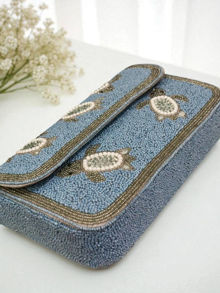 Bolso de mano de tortuga con cuentas azules: Bolso de noche bordado hecho a mano