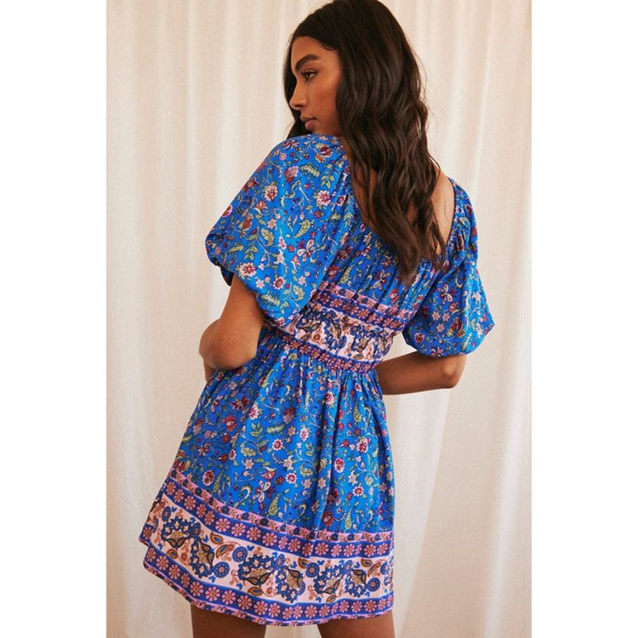 Minivestido Boho Azul de Lino y Algodón de Alta Calidad, Manga Corta Tropical, Estilo Chinoiserie con Lazos, Elegante, Sexy, Formal e Informal