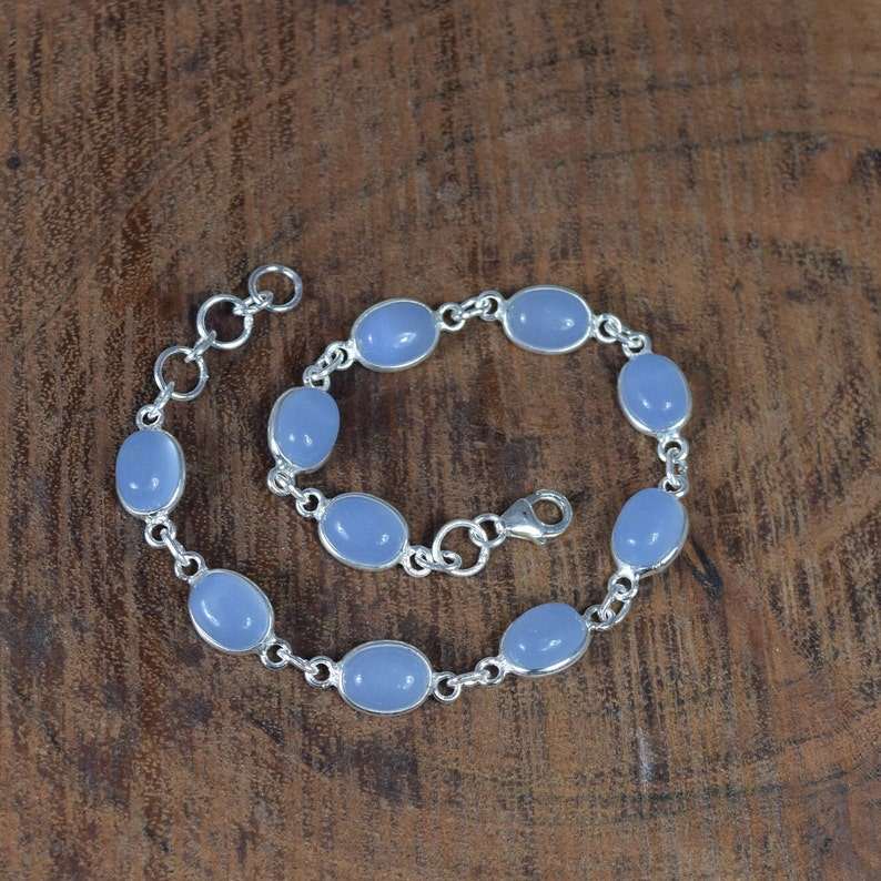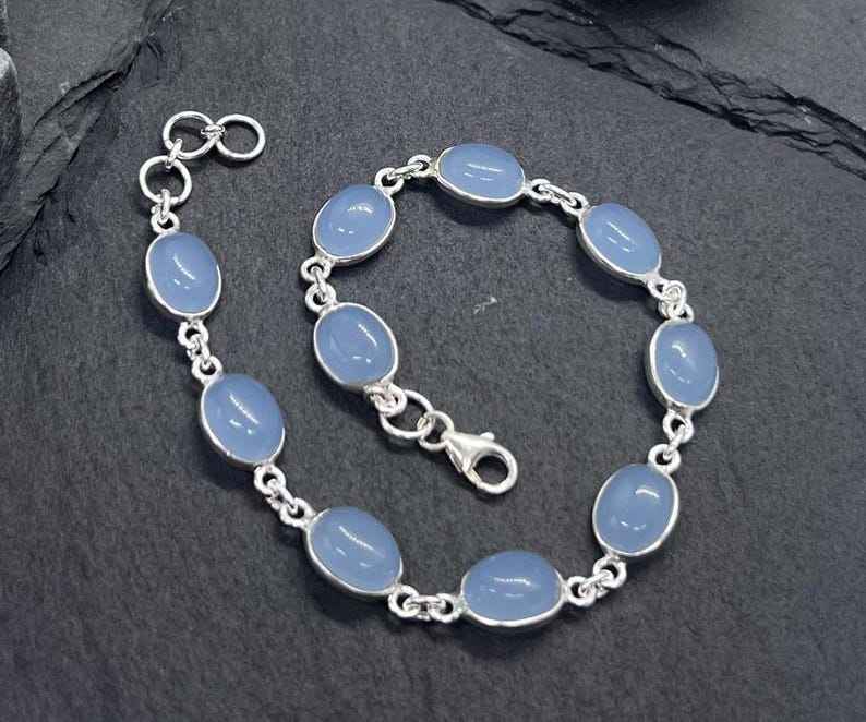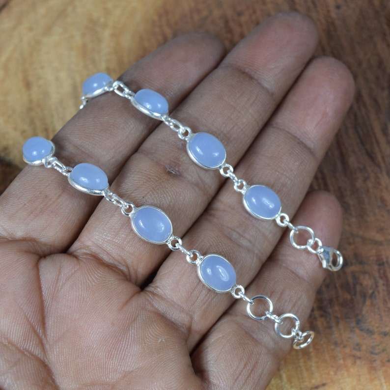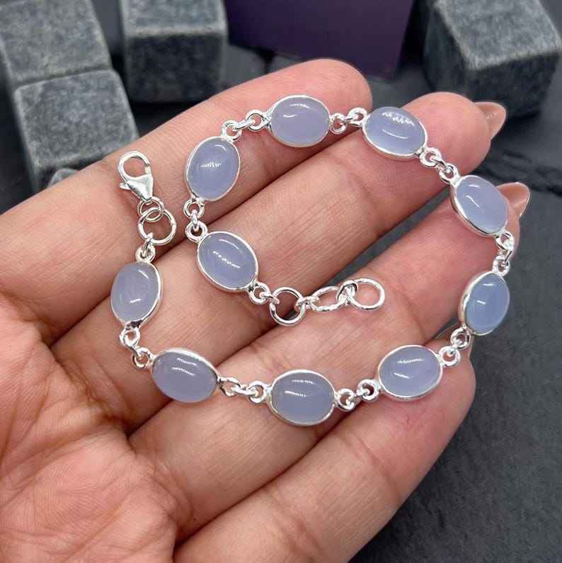 Pulsera Ajustable de Plata de Ley 925 con Calcedonia Azul, Joyería Artesanal con Piedras Preciosas, Regalo Glamuroso para Mujer