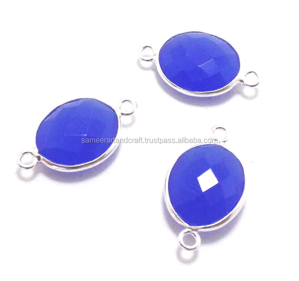 Conector de Bisel Ovalado Doble Facetado Hecho a Mano de Plata 925 para Joyería con Gema de Calcedonia Azul