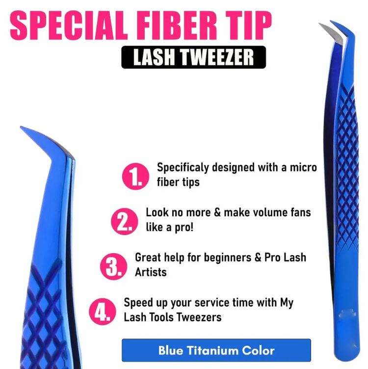 Pinzas para Extensión de Pestañas con Punta de Fibra de Acero Inoxidable con Recubrimiento de Color Azul para Aplicación Profesional en Salón