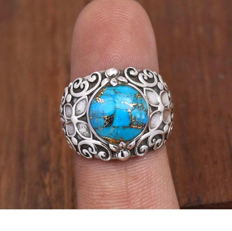 Anillo redondo turquesa de cobre azul, banda de flores de Plata de Ley 925, regalo de joyería de declaración de boda
