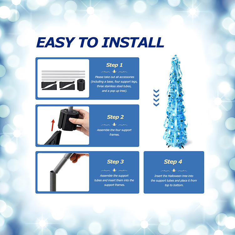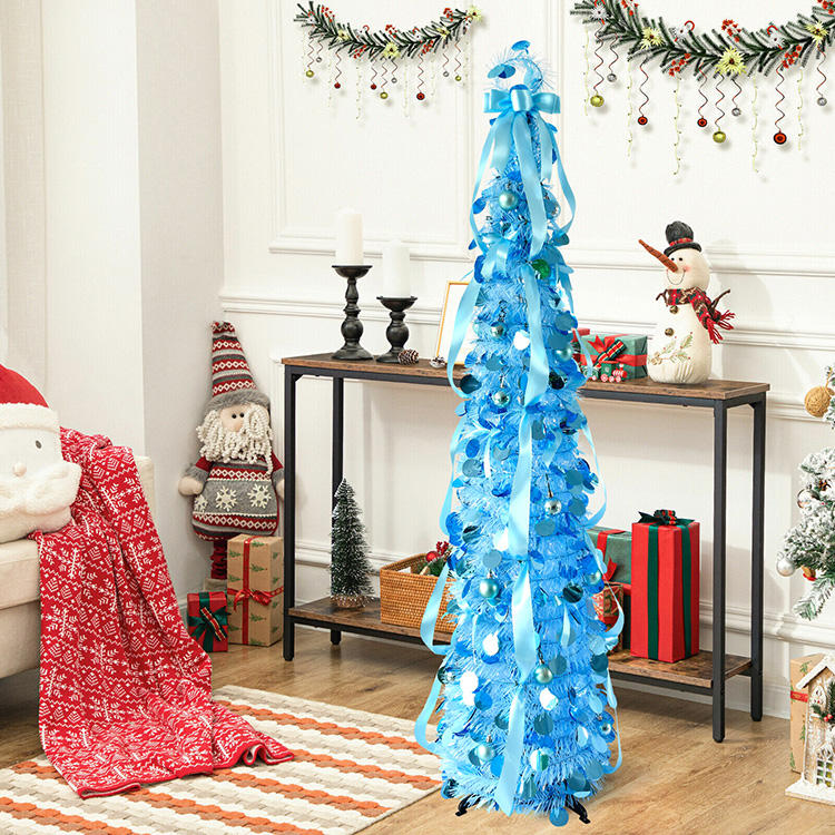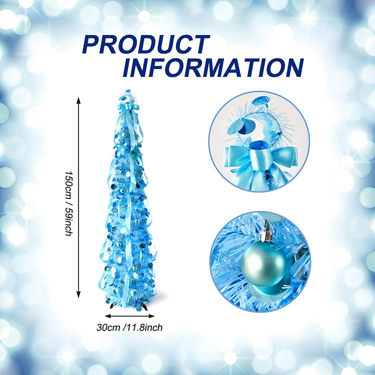 Árbol de Navidad Cónico Decorativo Azul con Cinta y Adornos, Fácil de Montar, para Decoración Navideña en Interiores del Hogar