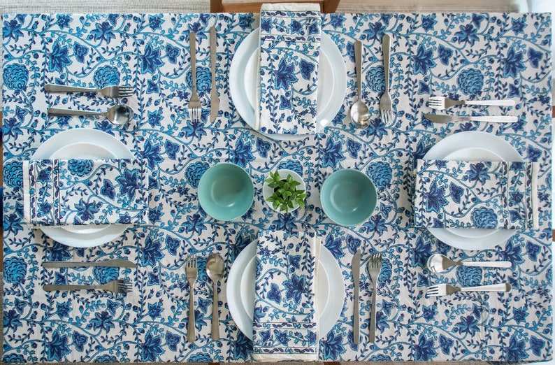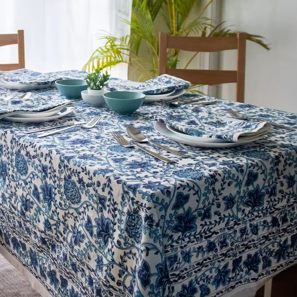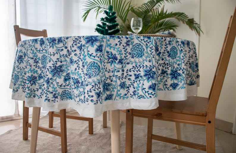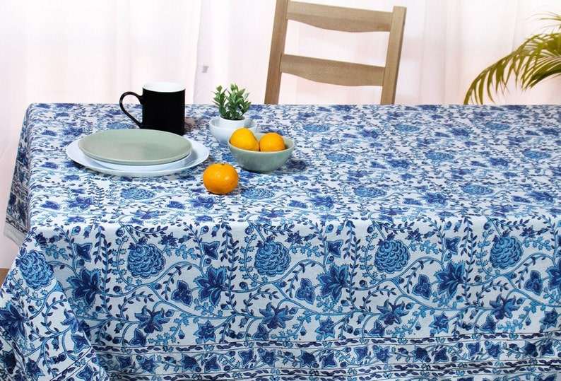 Mantel con estampado de bloque de mano floral azul Cubierta de comedor de algodón francés vintage