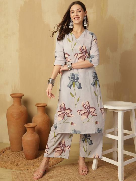 Kurta De Algodón Puro Con Estampado Floral Azul Cuello En V Con Palazzos
