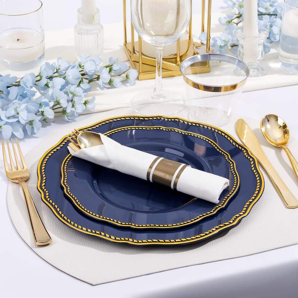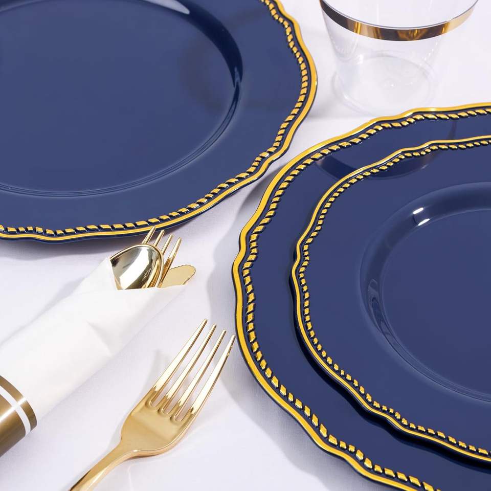 Juego de Platos de Plástico Azul Dorado, 350 Piezas, Kit de Artículos Desechables para Fiestas, Incluye 50 Platos para Cena, 50 para Postre y 50 Vasos