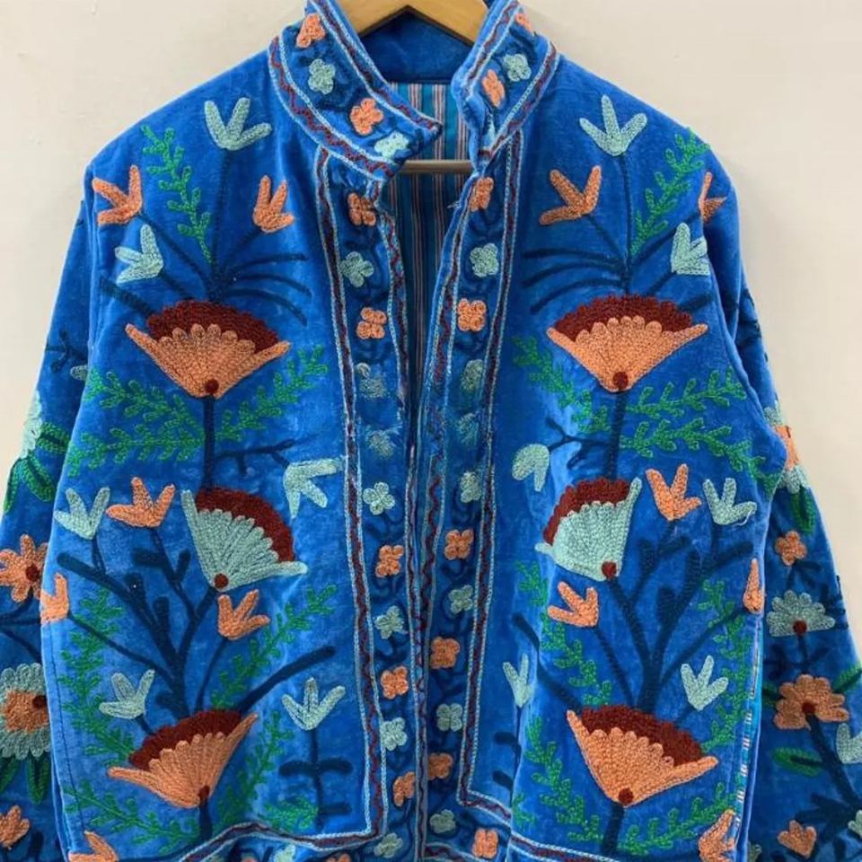 Chaqueta de invierno Suzani de terciopelo azul hecha a mano con bordado floral Abrigo corto de punto relleno de algodón a prueba de viento para Festival