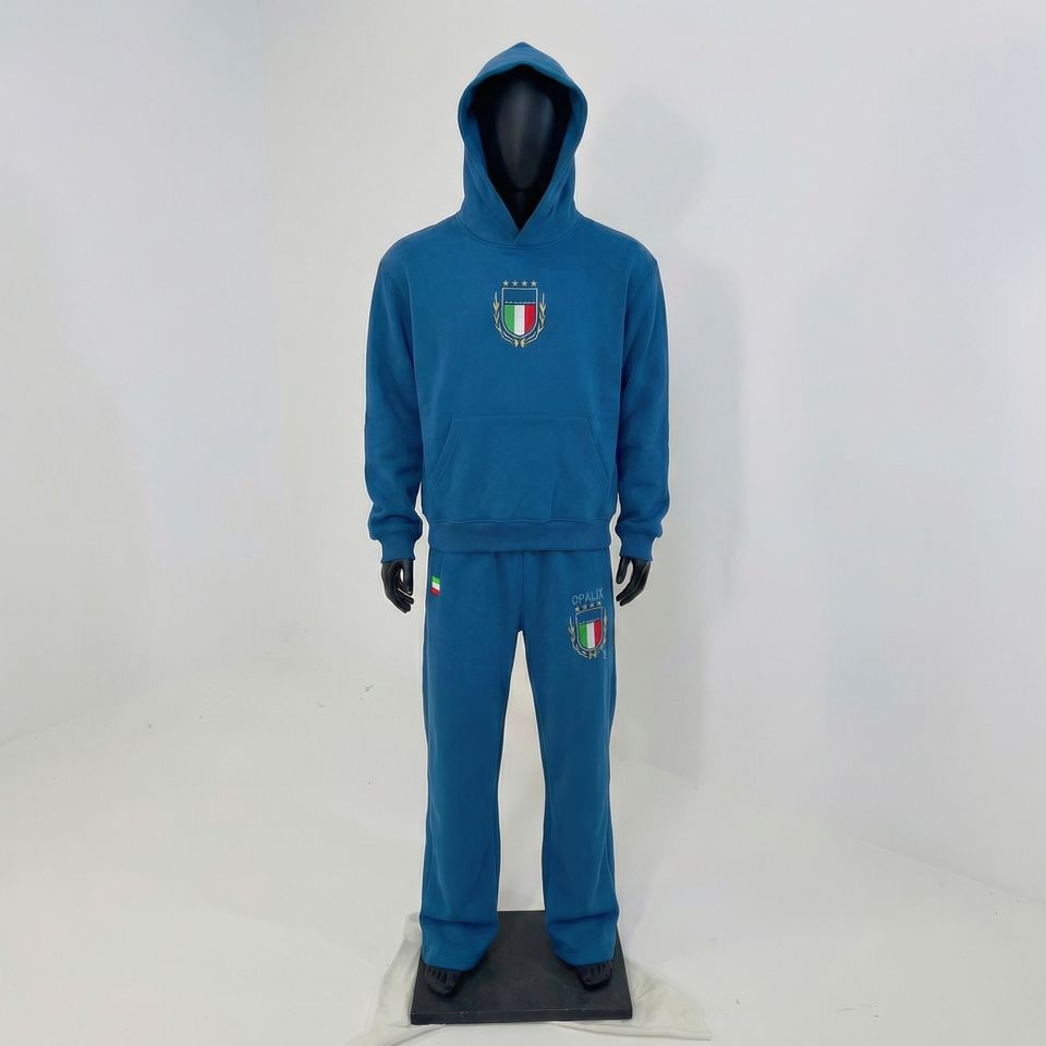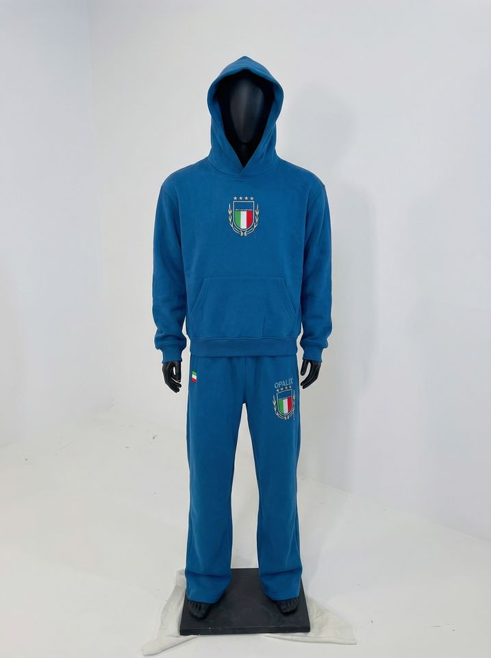 Conjunto de Chándal Azul con Capucha y Cresta Bordada en la Parte Delantera y Pantalón, Bolsillo Canguro, Fabricante de Ropa Urbana OEM/ODM