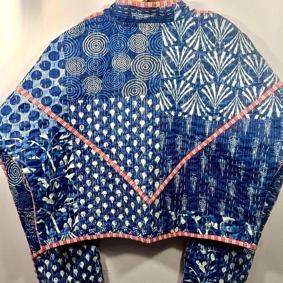 Chaqueta corta acolchada de invierno Kantha azul | Abrigo Reversible de Algodón con Estampado Floral y Cierre de Botones de Cuerno