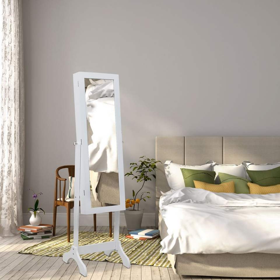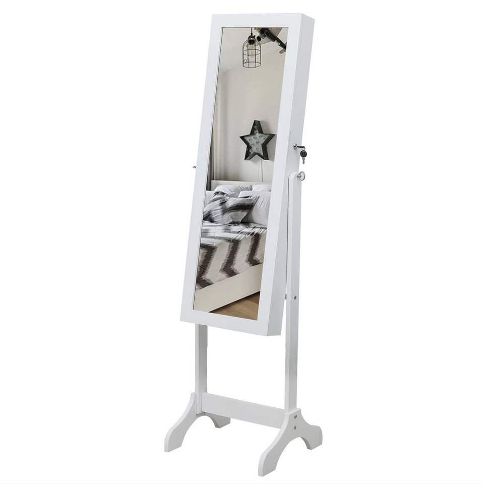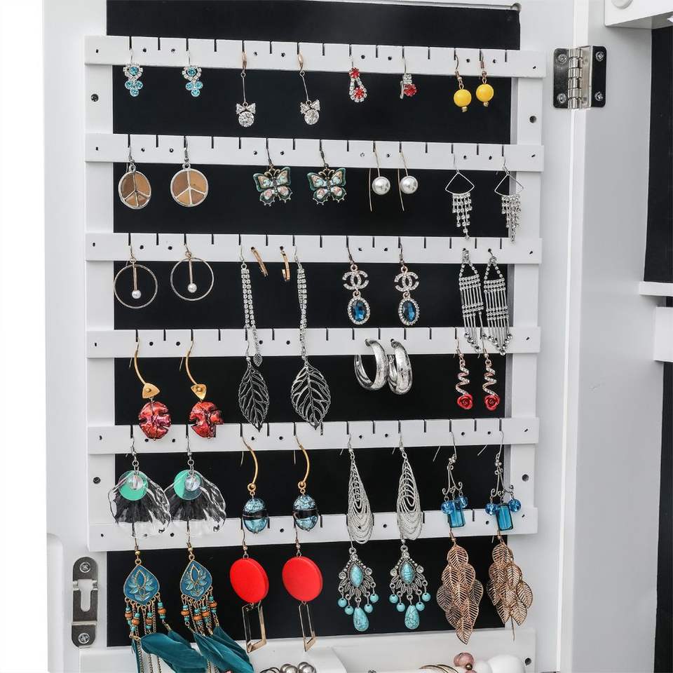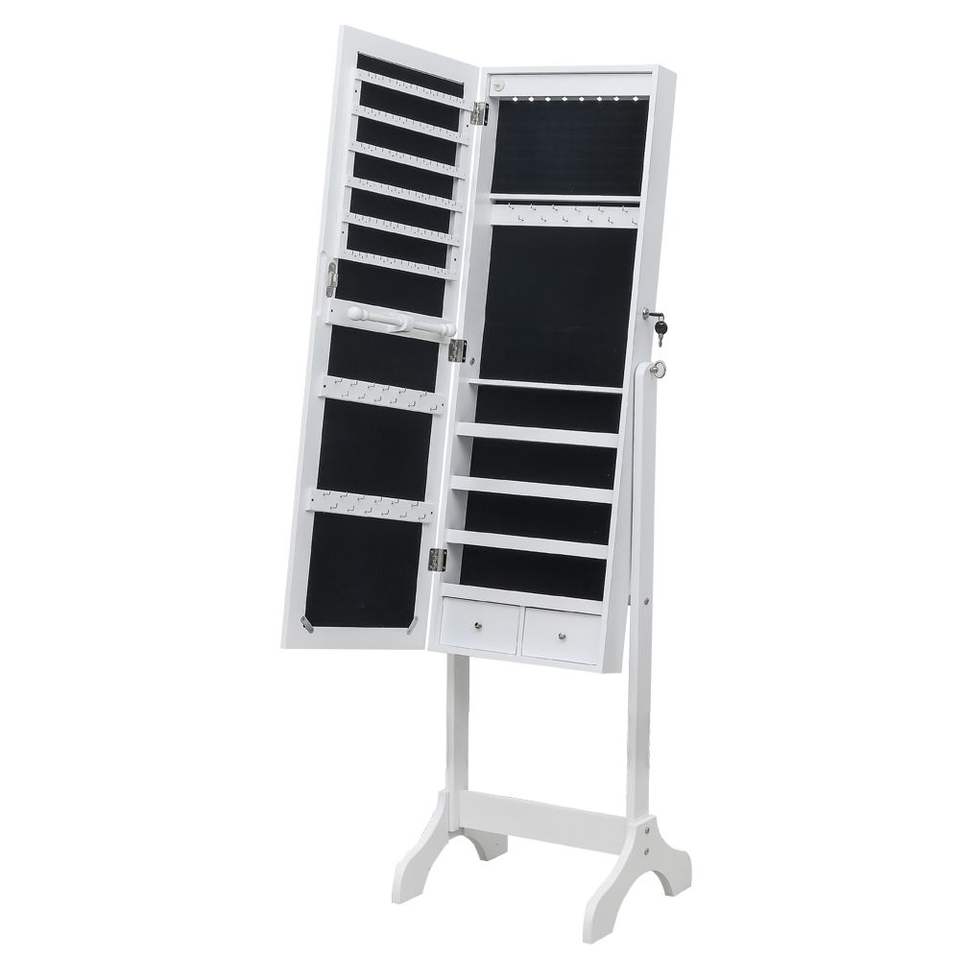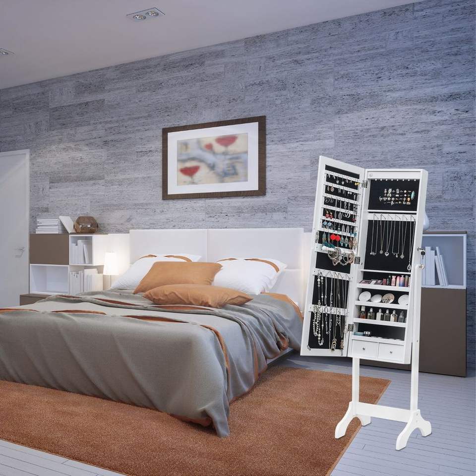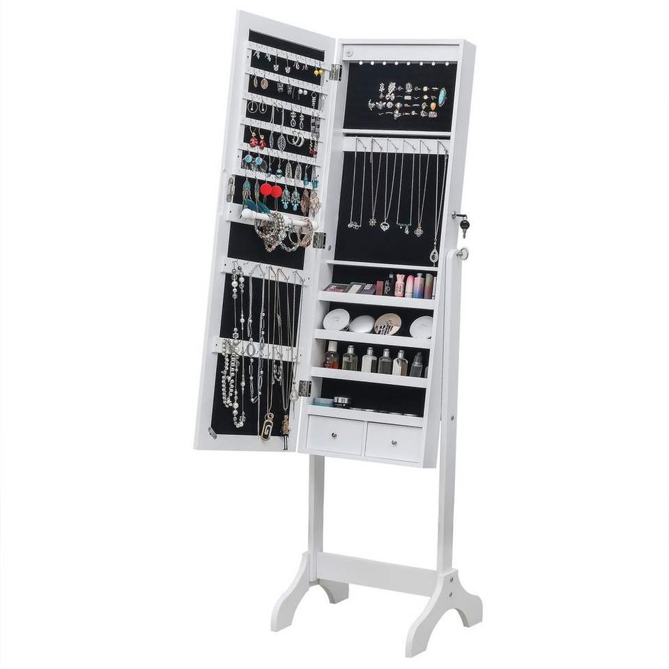 Organizador de Joyas de Madera Blanca de 4 Niveles con Luz LED Azul, 2 Cajones, Espejo Ajustable y 8 Luces LED Azules (No Completo)