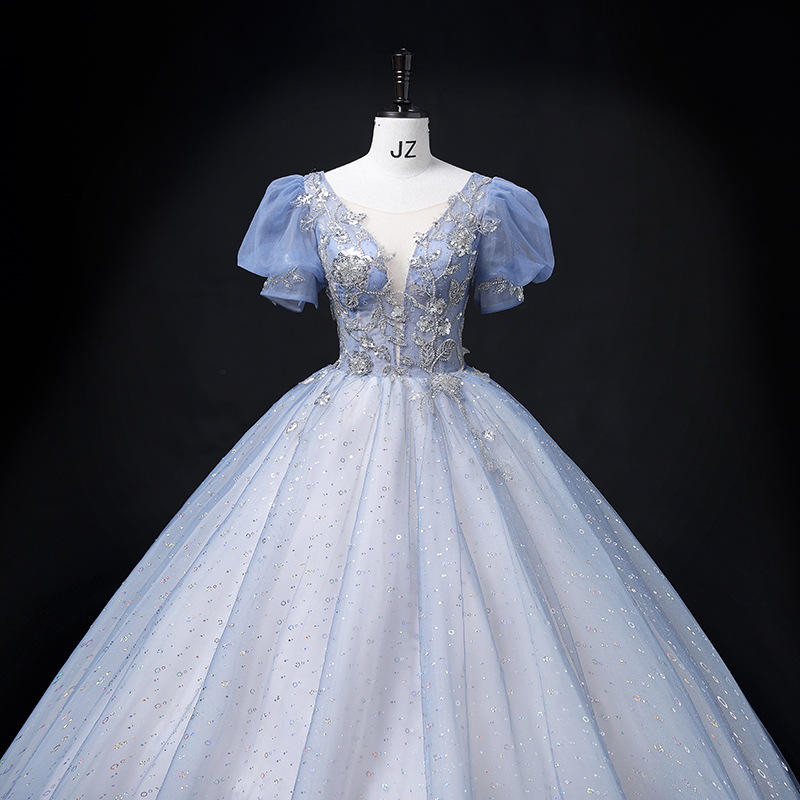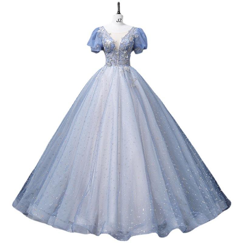 Blue Long Stage Performance Dress With Puffy Skirt For Girls Vocal Solo Exam Wear