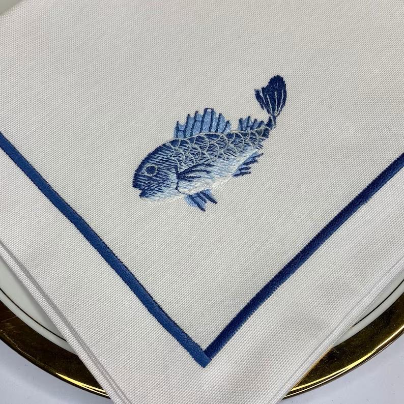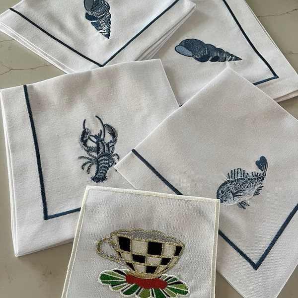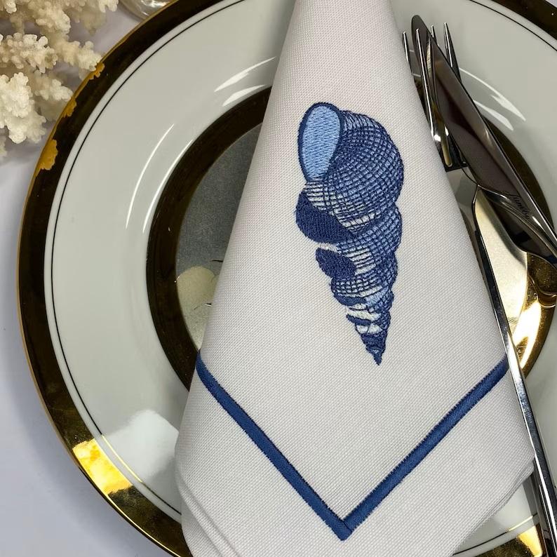 Juego de Servilletas de Mesa Otoñales con Diseño de Vida Marina Azul, 100% Lino, Bordadas con Diseño de Flor de Calabaza Otoñal, Elegantes Accesorios para Servilletas