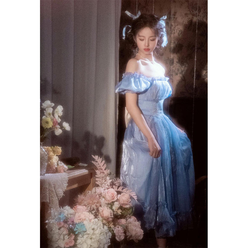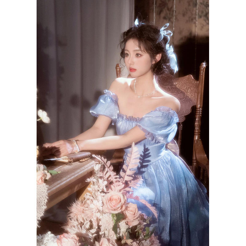 Blue Off-The-Shoulder A-Line Prom Dress Empire Waist Vintage Style For Studio Photography And Coming Of Age Ceremony