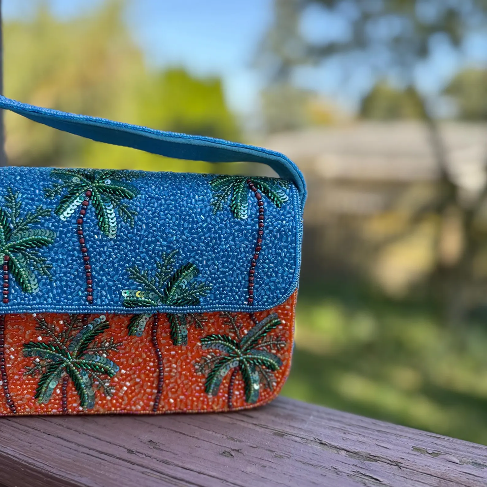Bolsa de Viaje para Mujer Hecha a Mano con Cuentas de Palmera Azul, Color y Tamaño Personalizables, Inspirada en el Océano, con Correa Ancha y Bordado, Estilo Moderno