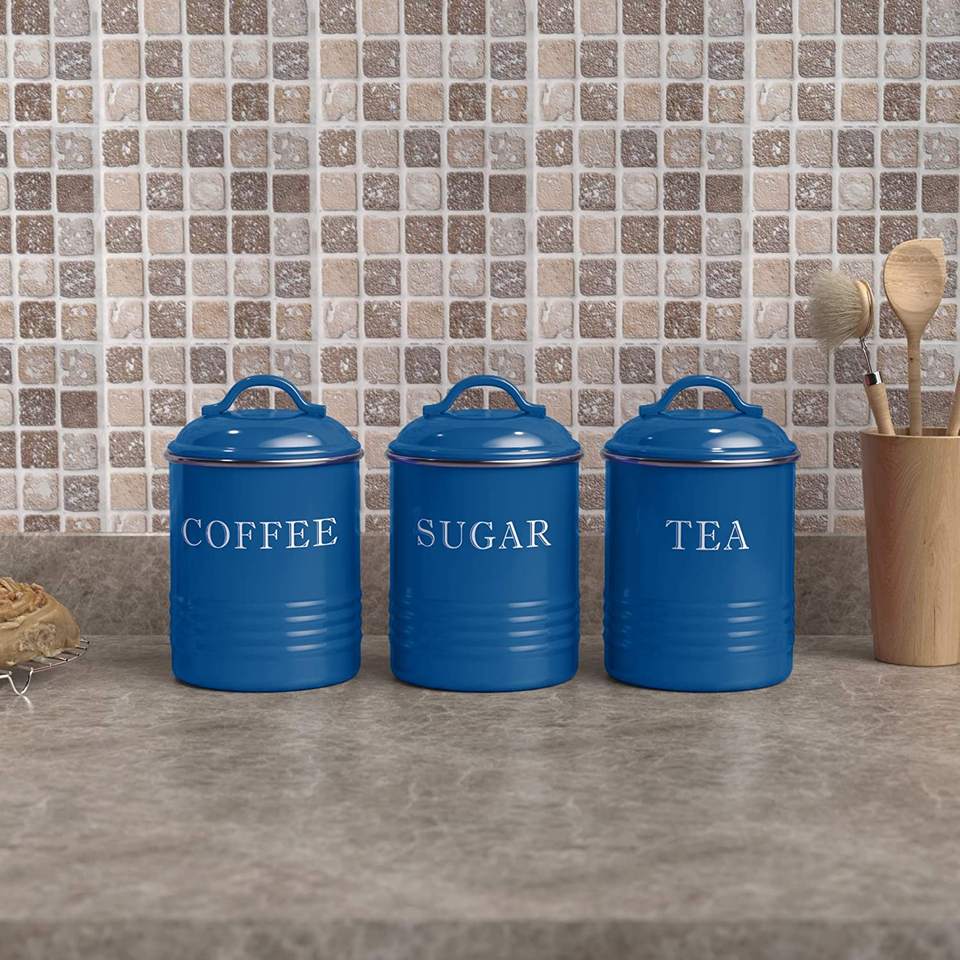 Bote redondo de Metal recubierto de polvo azul, con tapa