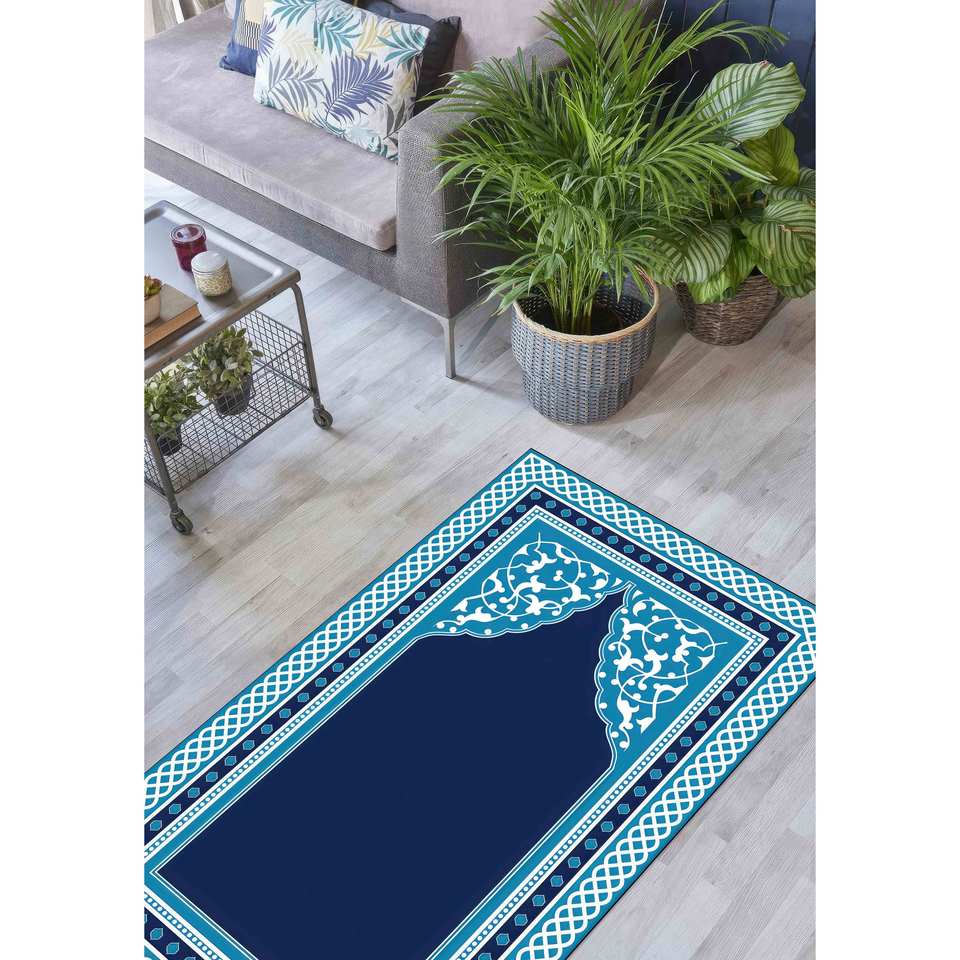 Alfombra de Oración Azul: Decoración Islámica para Mezquita, Regalo Espiritual, Alfombra Impresa, con Pelo Suave