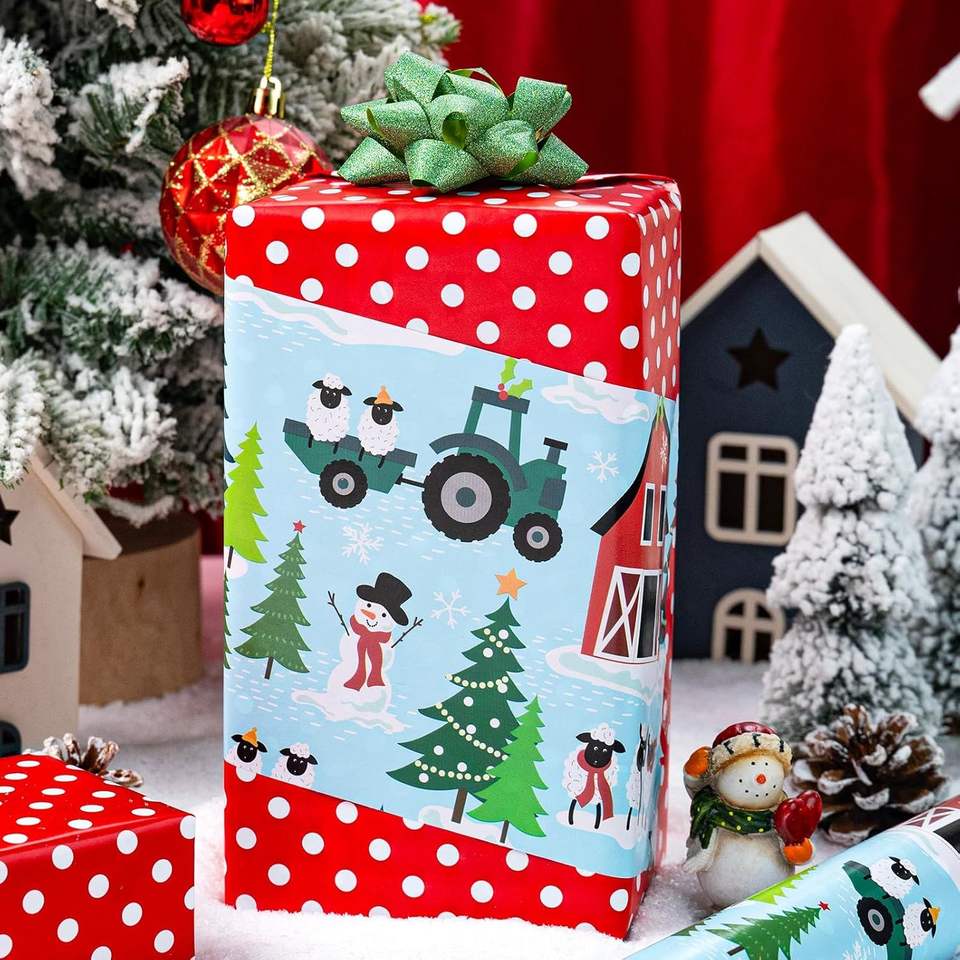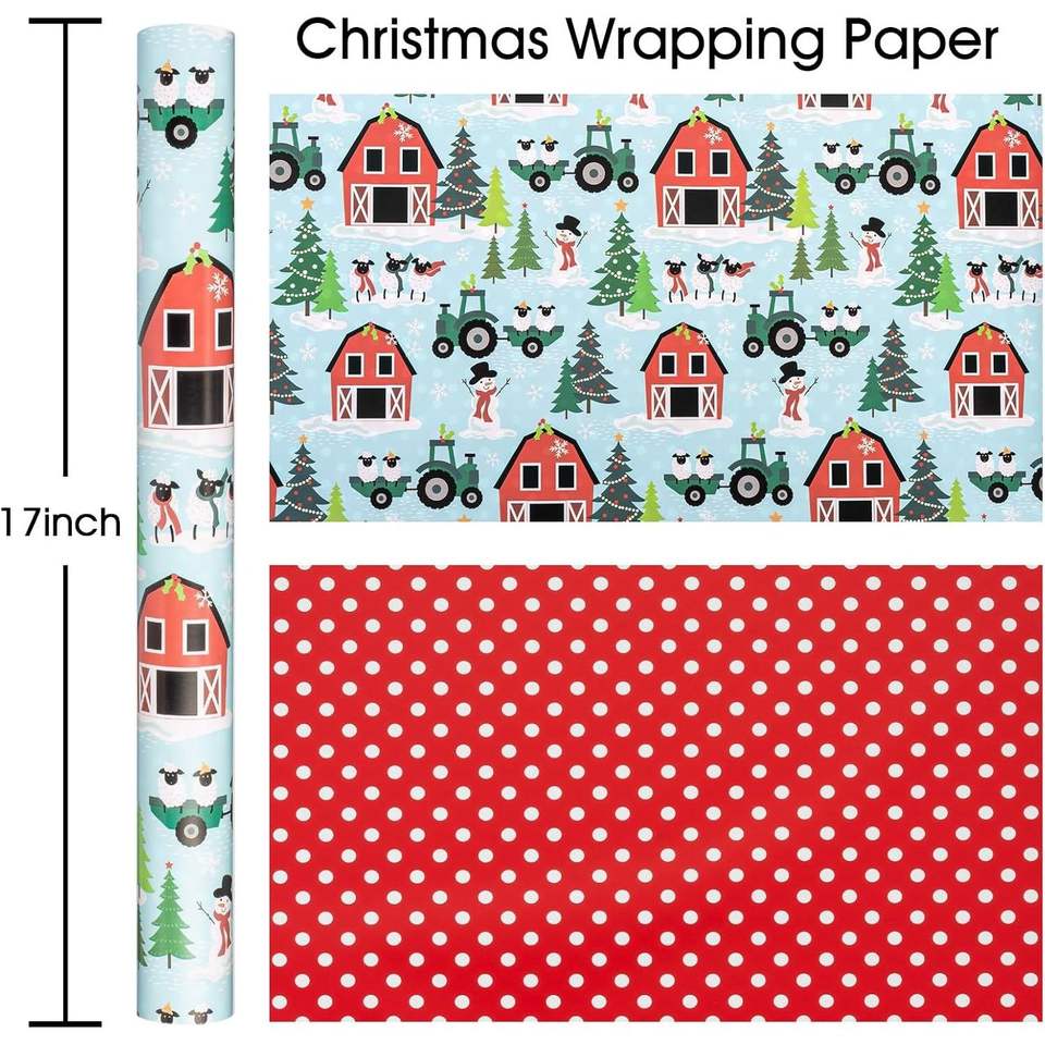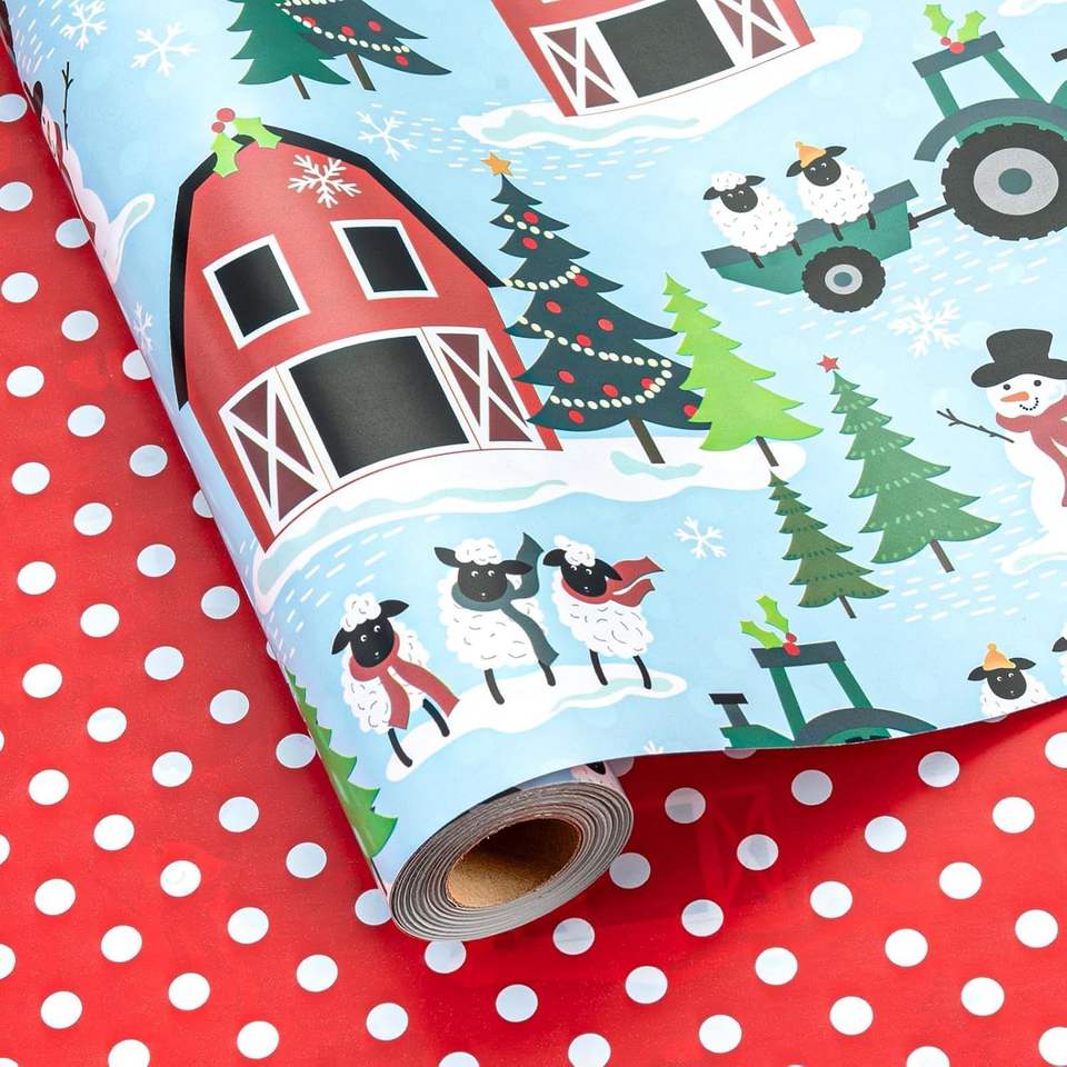 Rollo de Papel de Regalo Navideño Reversible Azul con Diseño de Ovejas, Muñecos de Nieve y Árboles de Navidad Rojos con Copos de Nieve, Tema de Granja