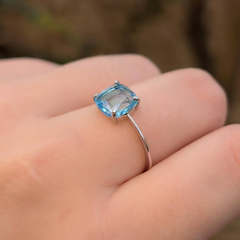 Anillo apilable solitario cuadrado de topacio azul, plata de ley 925, chapado en oro de 14 quilates, joyería duradera con piedras preciosas para mujer