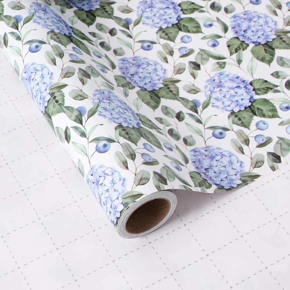 Rollo de Papel de Regalo con Diseño Floral de Hortensias en Acuarela Azul, 17 Pulgadas x 16.5 Pies, para Envolver Regalos, Bodas y Eventos Nupciales