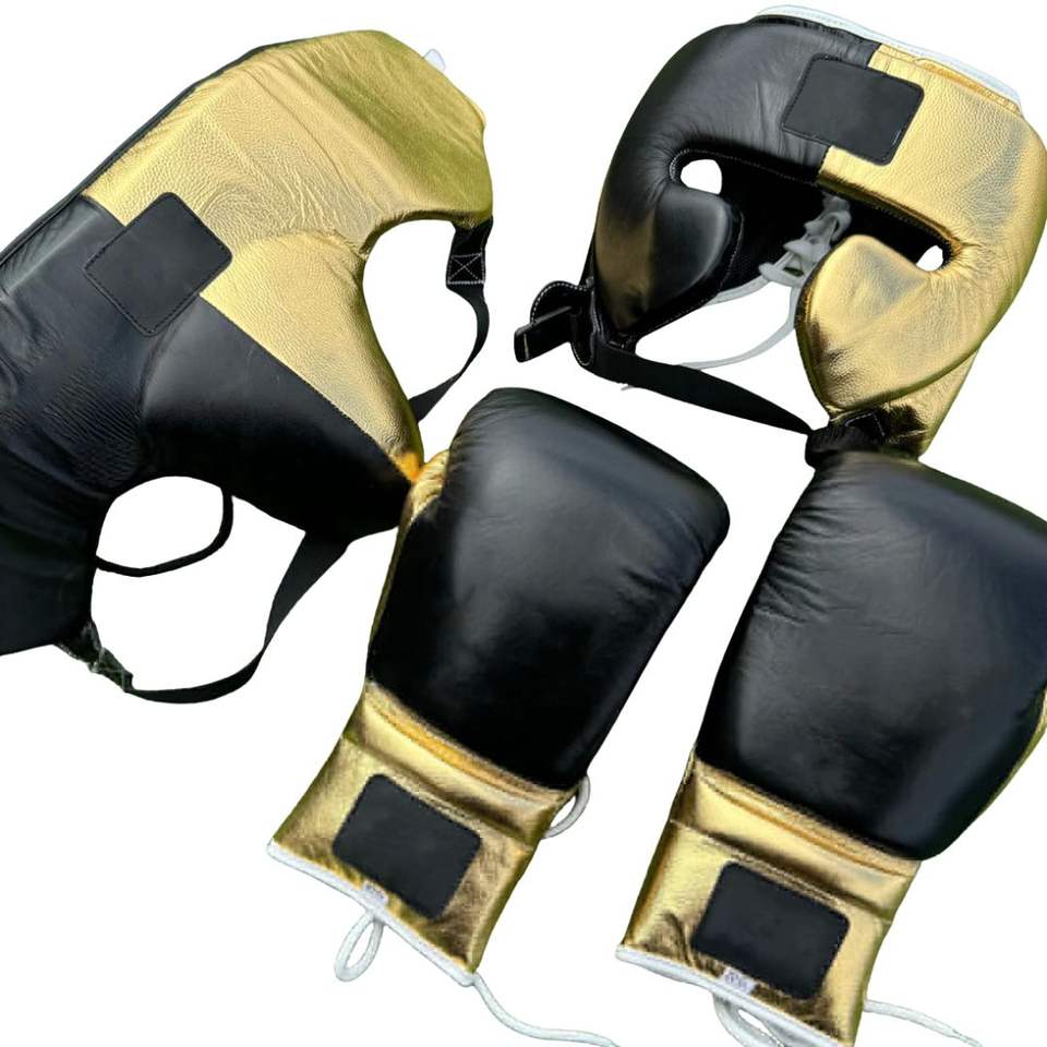 El set incluye:Guantes, Protección para la cabeza, Protector de ingle