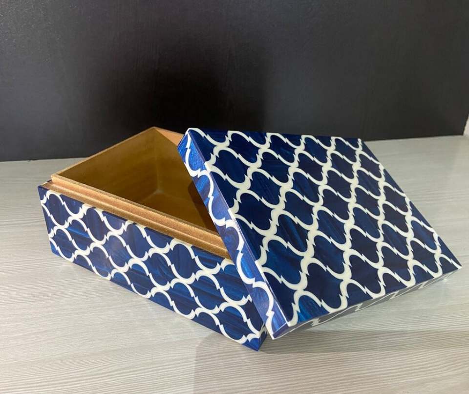 Nombre del producto:Caja de recuerdo marroquí Morrish Caja de joyería de madera azul con incrustaciones de hueso