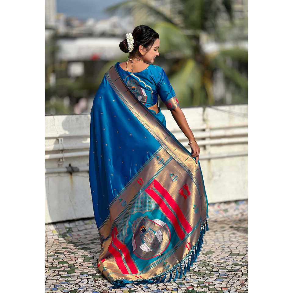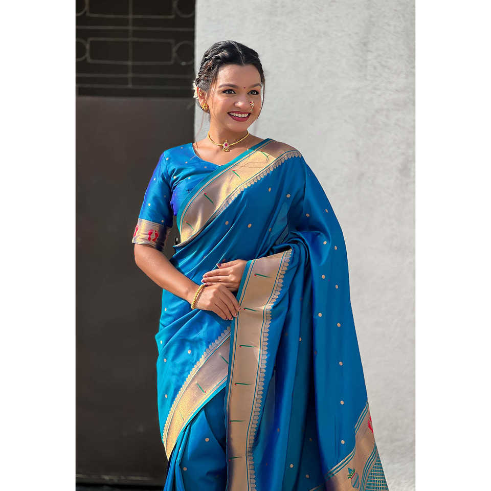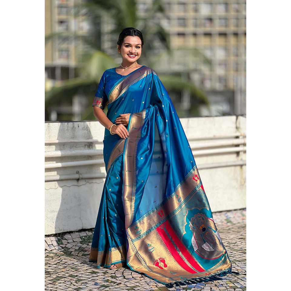 Sari de Seda Paithani Azul con Bordado Zari, Ropa India y Pakistaní de Elite Weaves, 650g