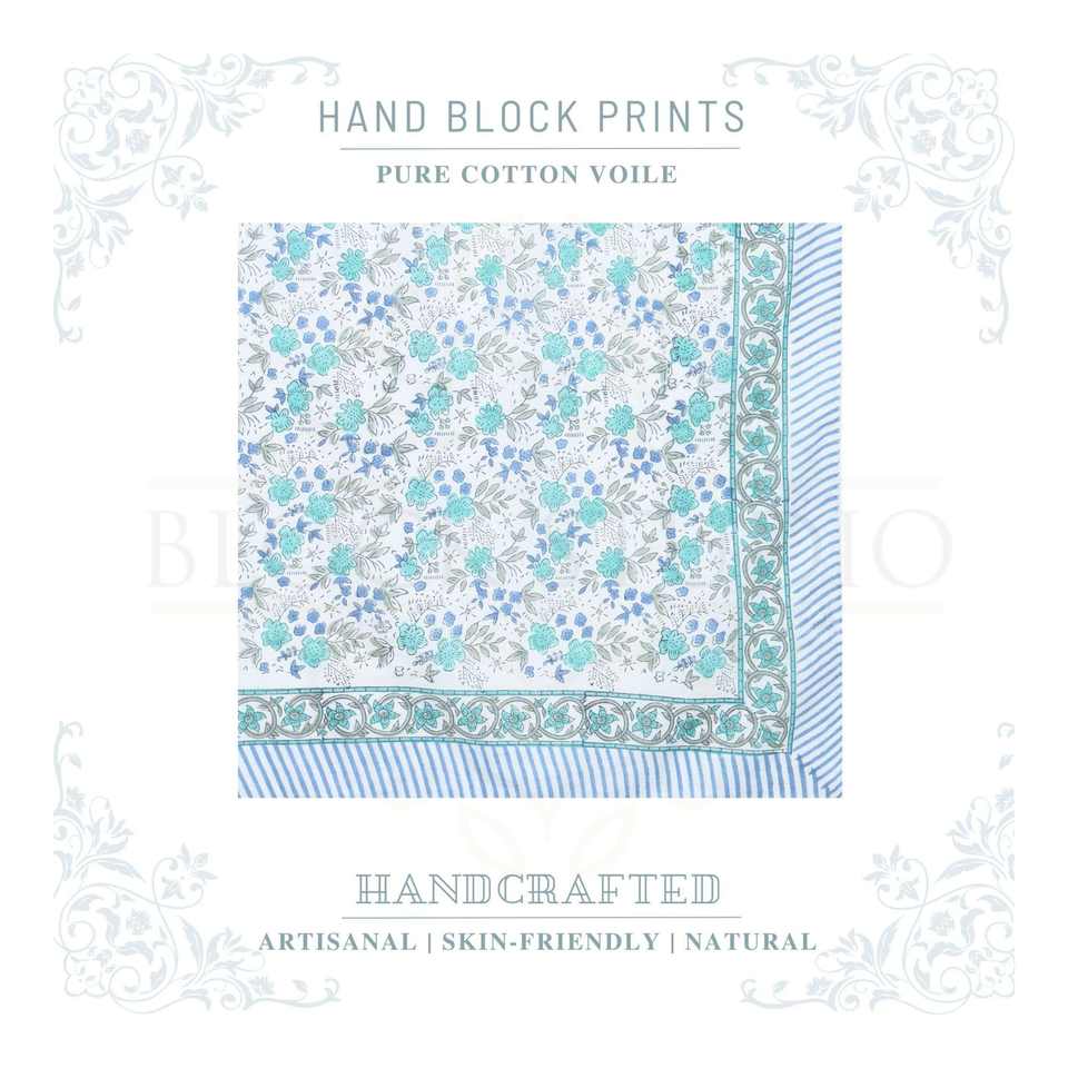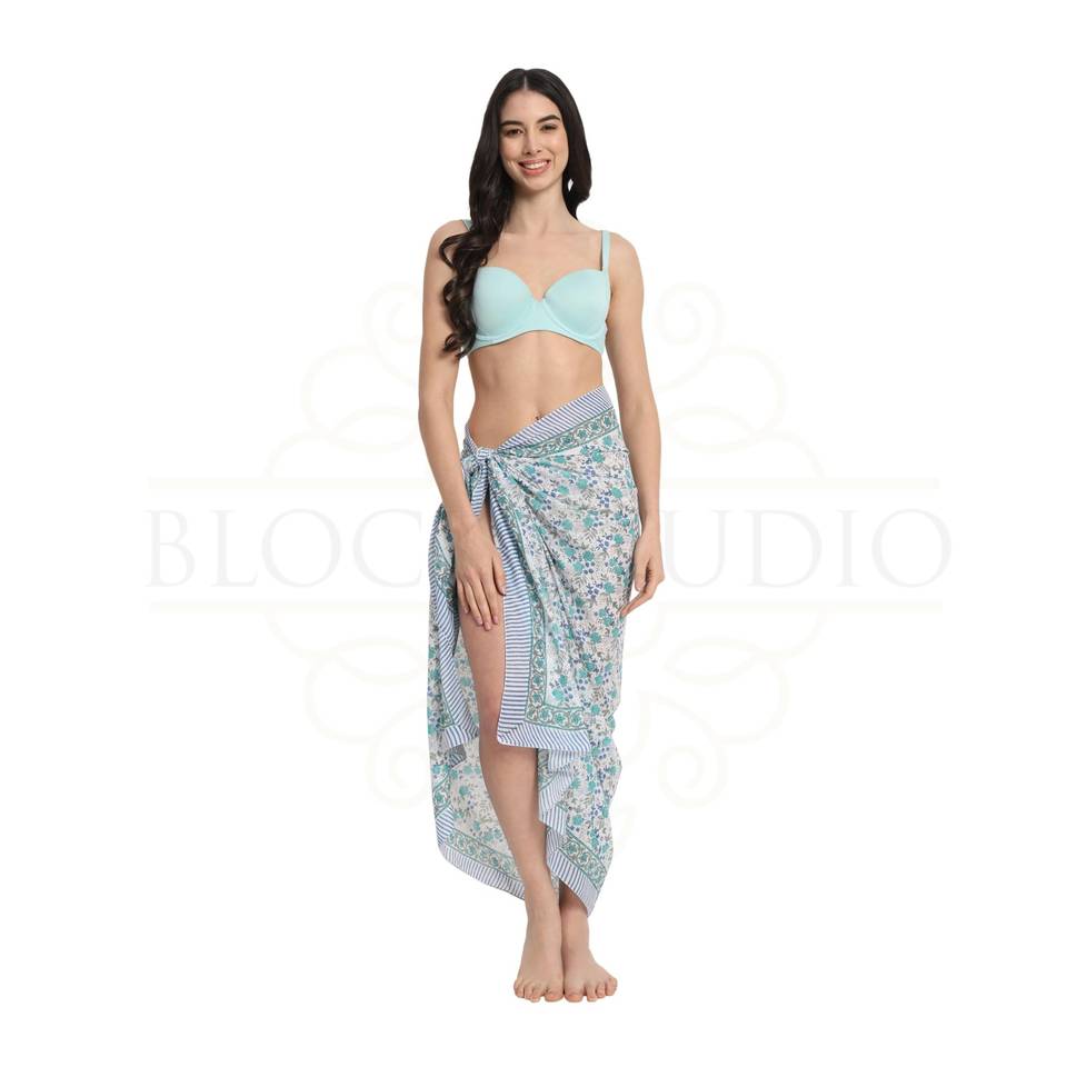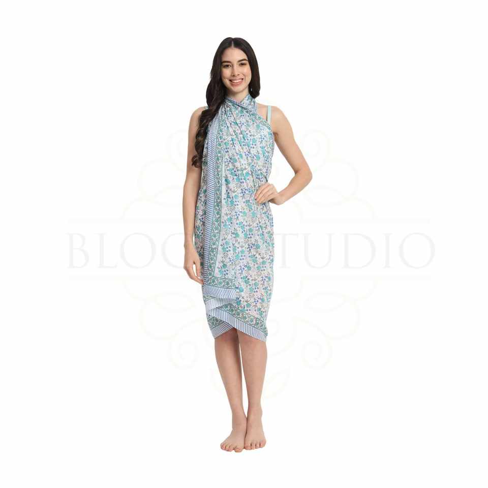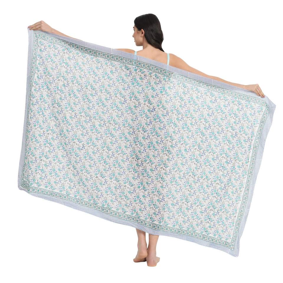 Pareo de Algodón con Estampado a Mano en Azul y Turquesa para Mujer, Ligero, para Usar como Cubrebañador, Ropa de Playa y Resort para el Verano