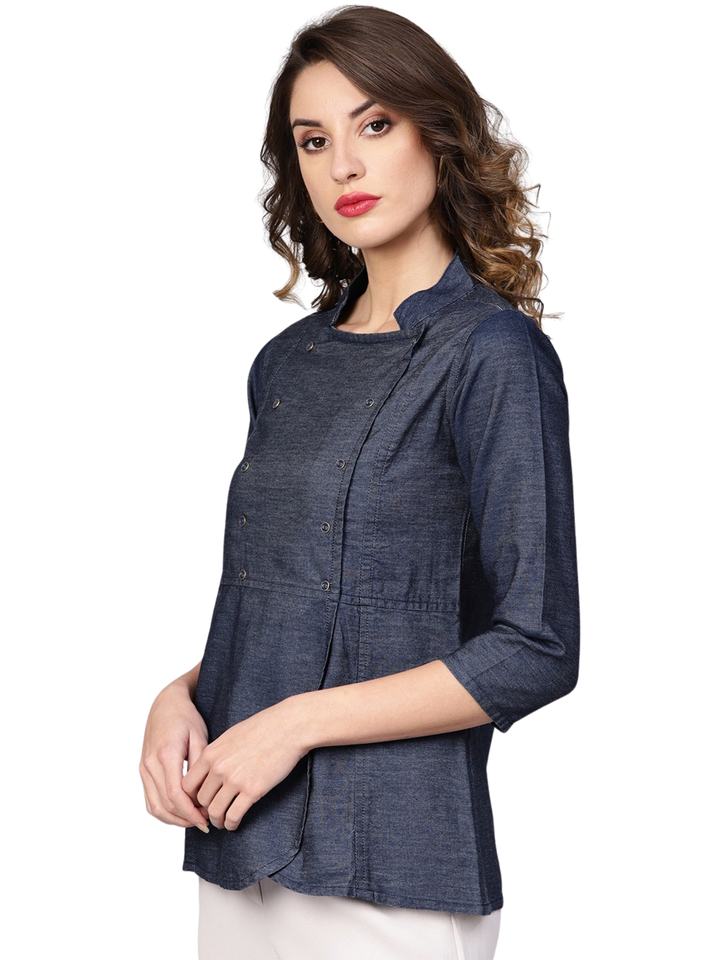 Top azul denim de corte regular con cuello mandarín y mangas 3/4, talla S, hecho para un uso casual, cómodo y suave para el día a día.