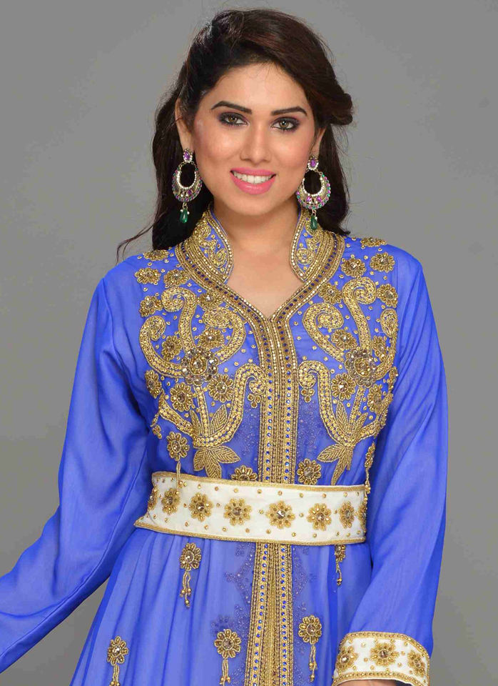 Caftanes islámicos Georgette bordados azules con hijab a prueba de sol.