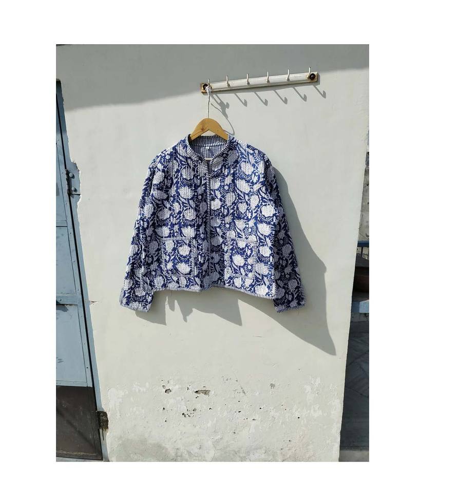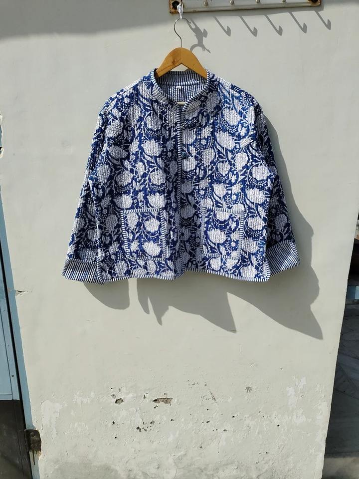 Chaqueta Kantha Azul y Blanca Cosida a Mano, Abrigo Indio Hecho a Mano, Patchwork Acolchado, Kimono con Estampado de Bloques Indio