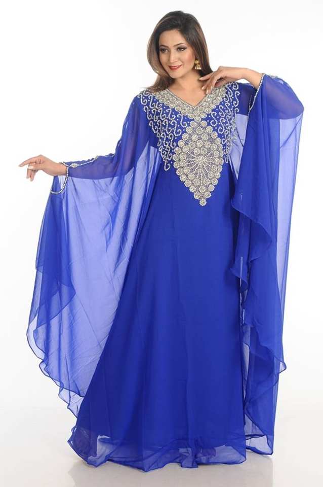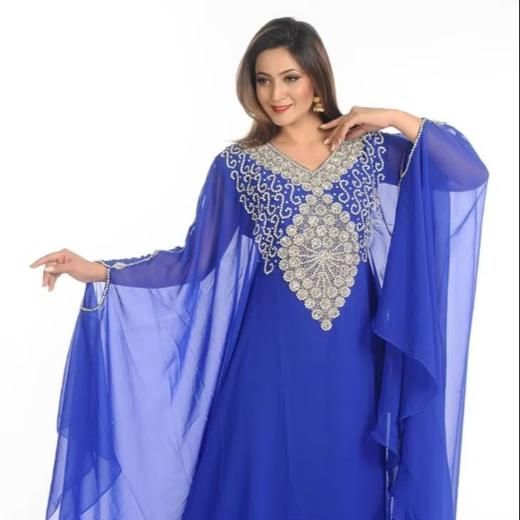 Azul Zari trabajo Georgette estilo islámico fiesta usar piedras y cuentas incrustadas caftán árabe