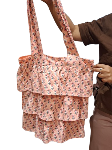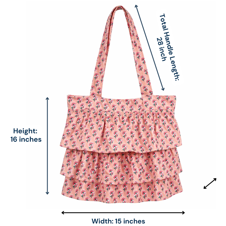 Bolsa de Mano de Algodón con Estampado Floral Rosa Pálido, con Volantes en Capas, con Asas de Hombro, Ligera, Hecha a Mano, Ecológica, para Viajes y Compras