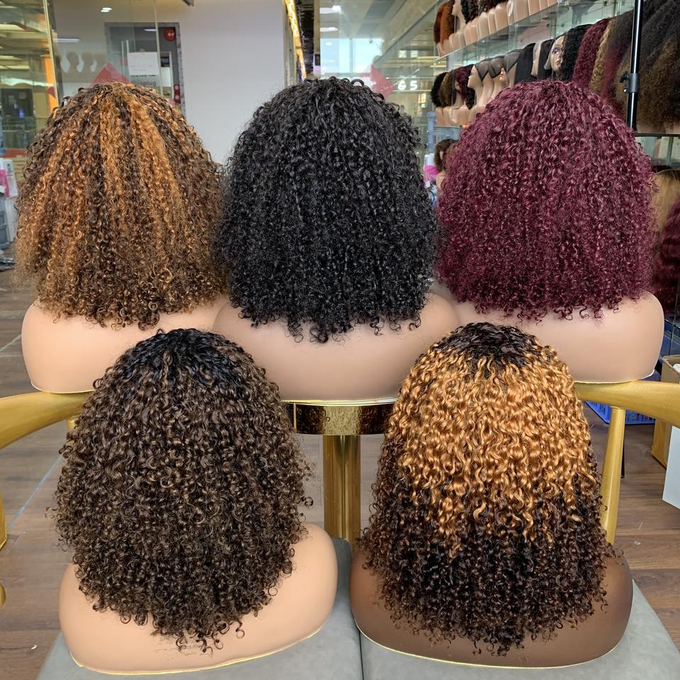 Peluca Bob de Cabello Brasileño, Hecha a Máquina, Sin Encaje, Peluca Bob SDD, Peluca Bob Rizada de 14 Pulgadas con Flequillo