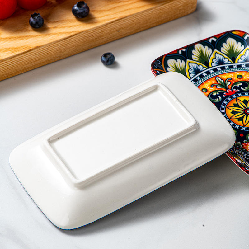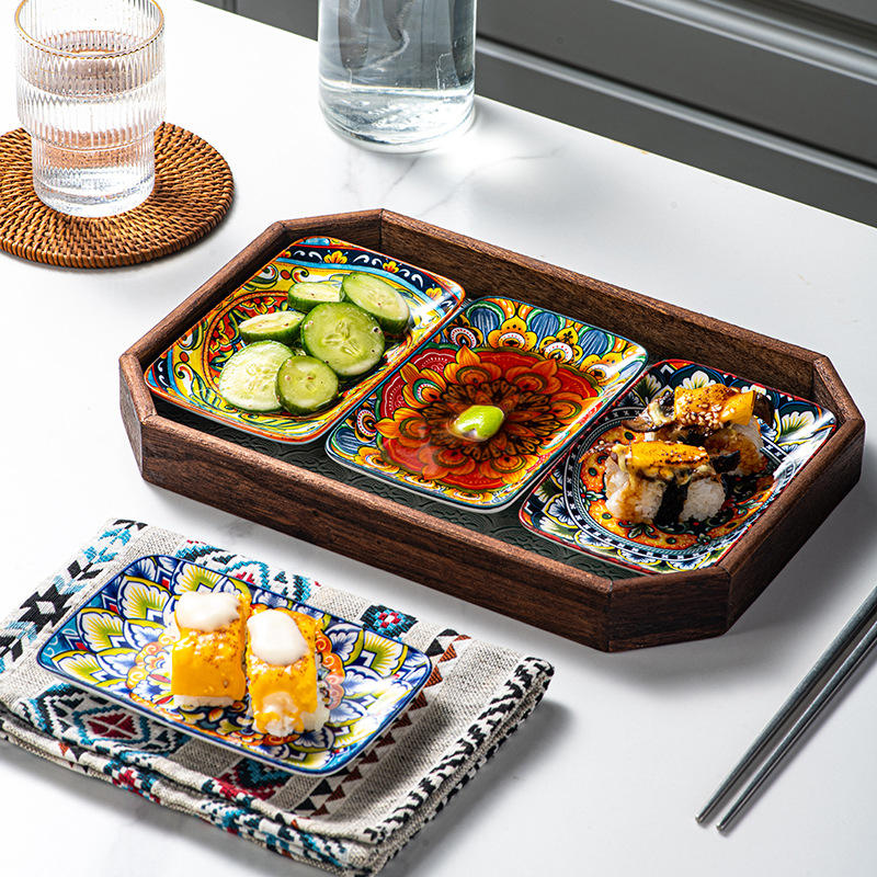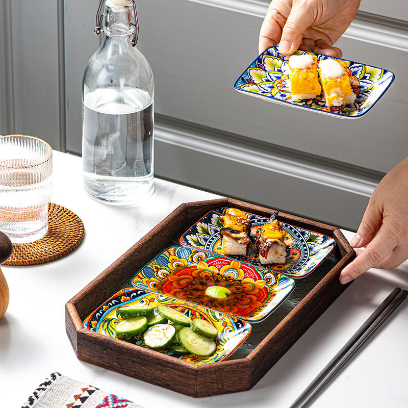 Juego de Vajilla Rectangular de Cerámica Estilo Bohemio, Apto para Microondas, con Diseño de Plantas y Color Subesmaltado, Platos Creativos para Sushi, Postres y Aperitivos