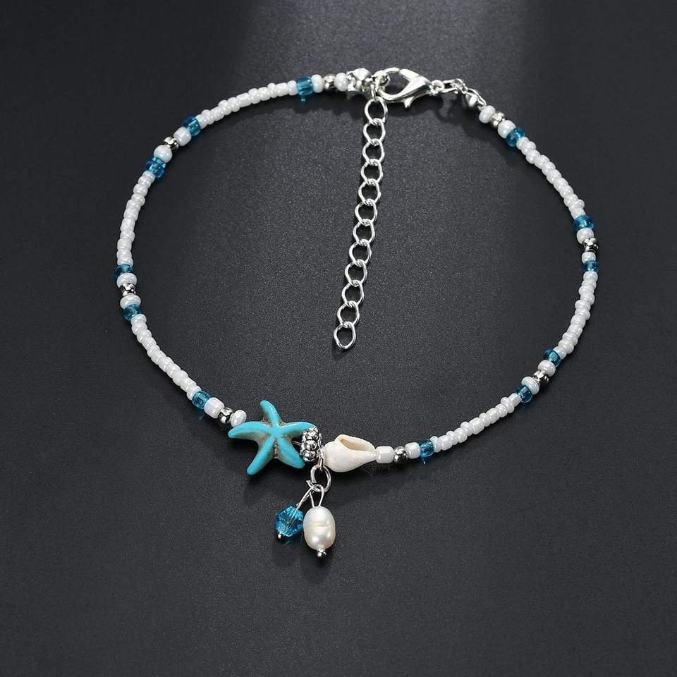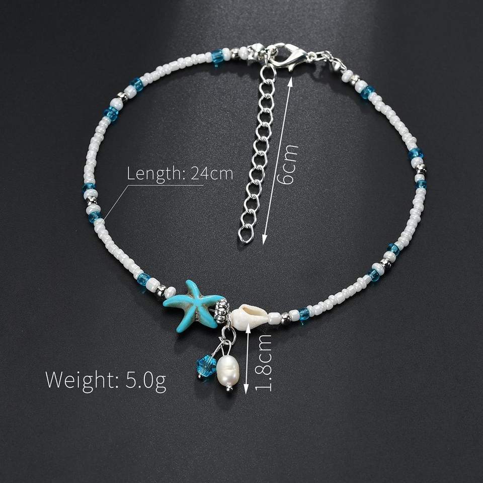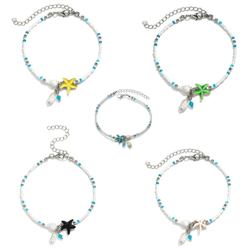 Tobillera Bohemia Colorida Elástica de Verano para Playa y Surf con Cuentas de Semillas, Estrellas de Mar, Perlas y Conchas, Ajustable, Joyería para Mujer