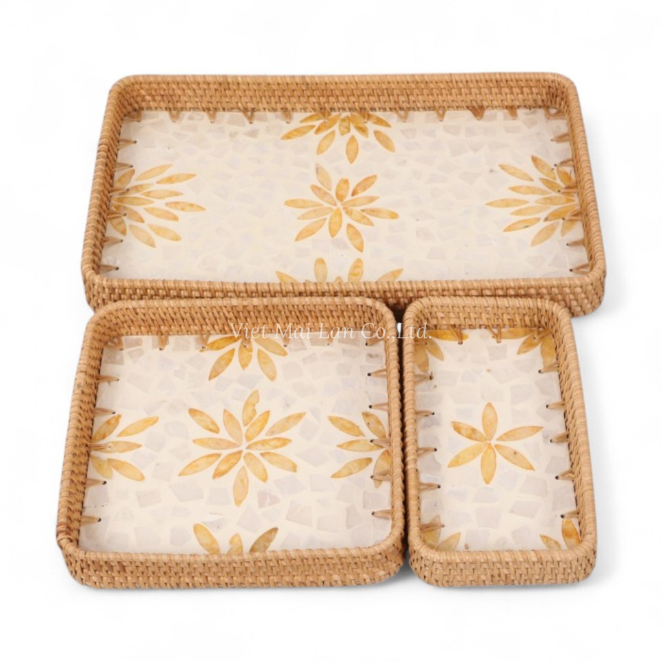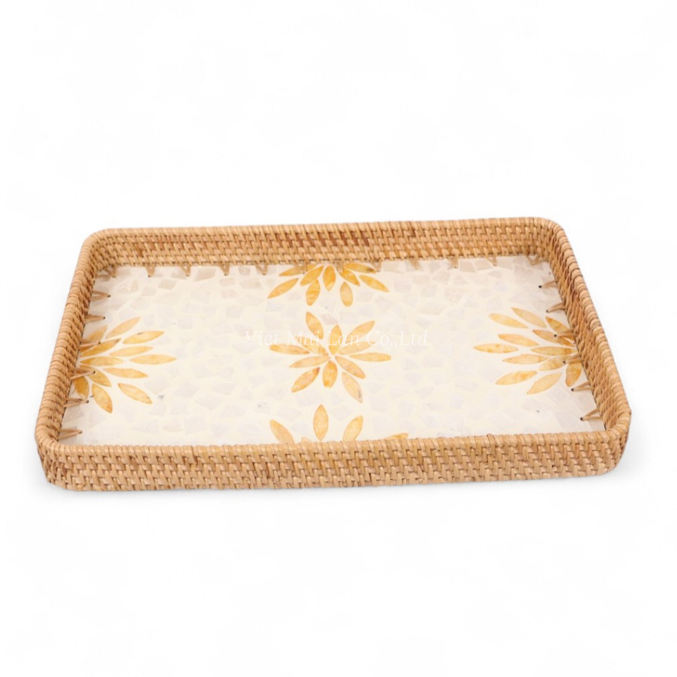 Bandeja de Servicio de Diseño Flexible de Ratán Hecha a Mano Estilo Bohemio con Madreperla para Servir Alimentos Diariamente, Uso en la Cocina y Exhibición en la Mesa