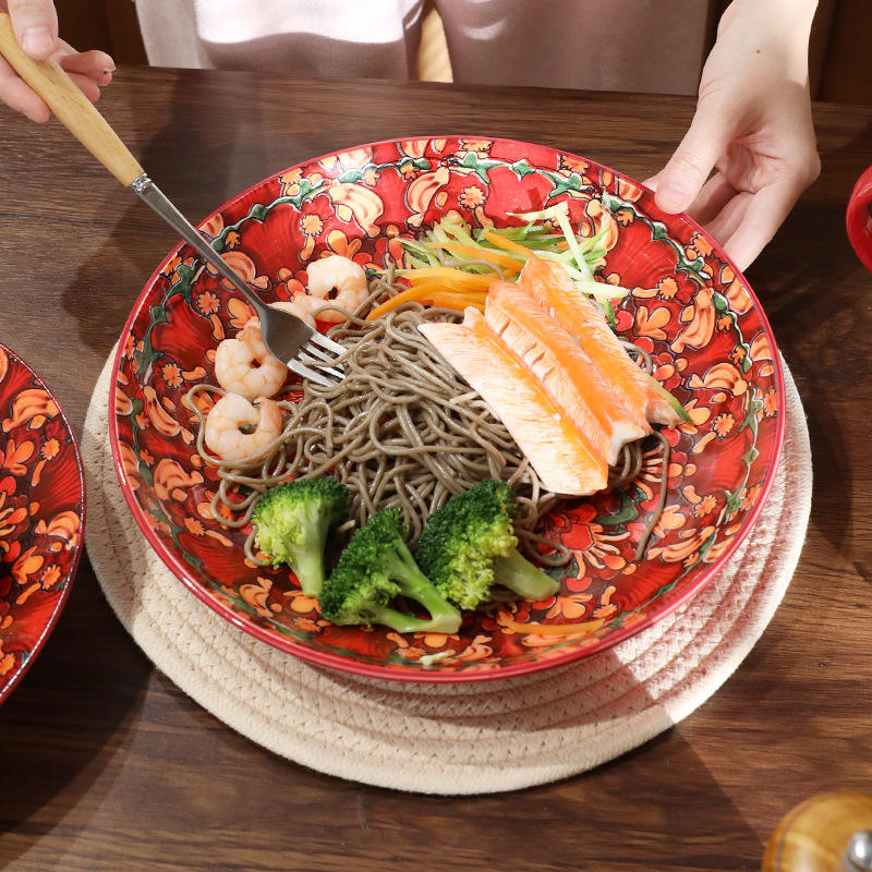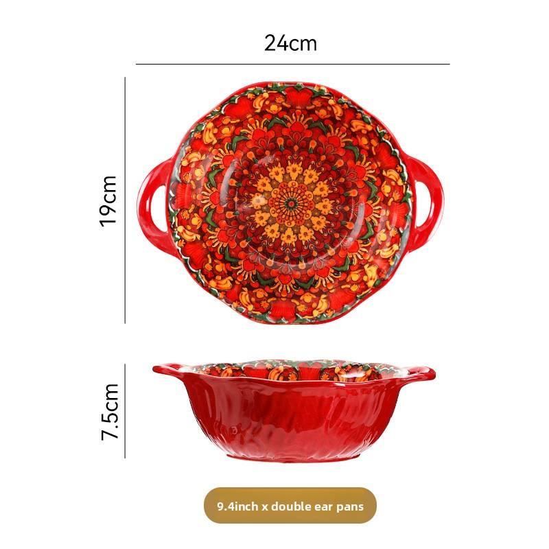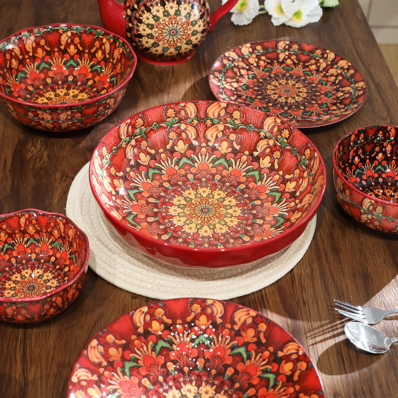 Juego de Platos y Tazones Redondos con Diseño Bohemio, Aptos para Microondas, para Bodas y Celebraciones de Cumpleaños - Diseño Rojo Bohemio