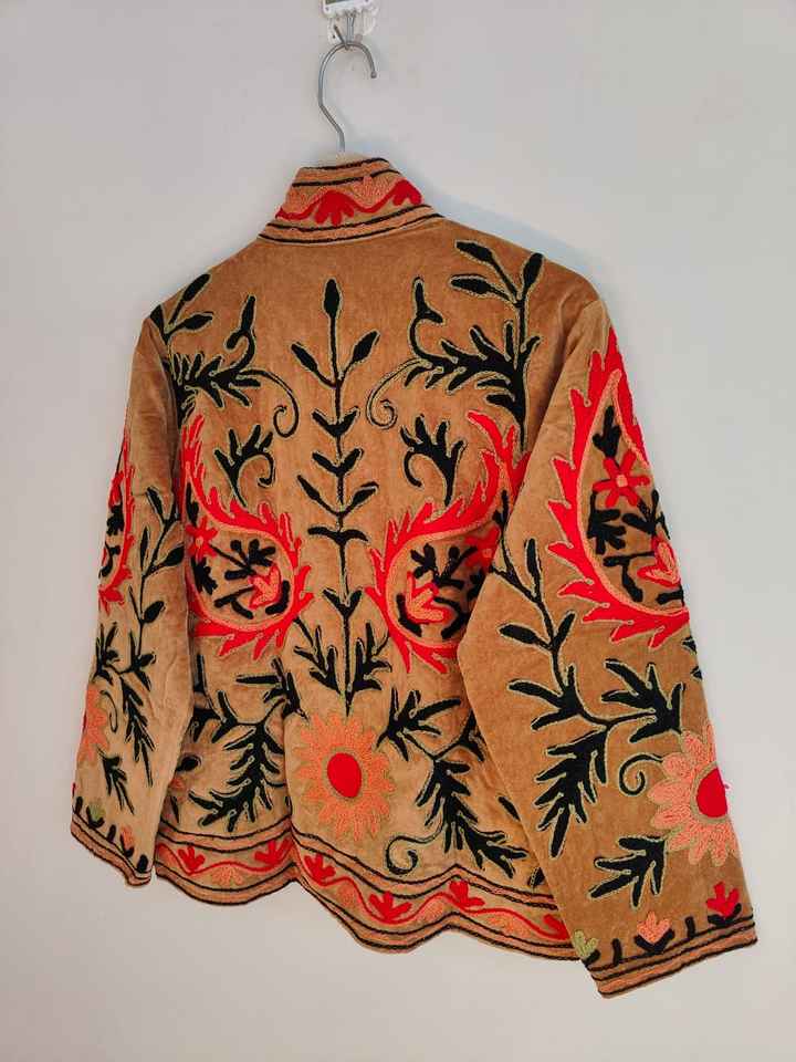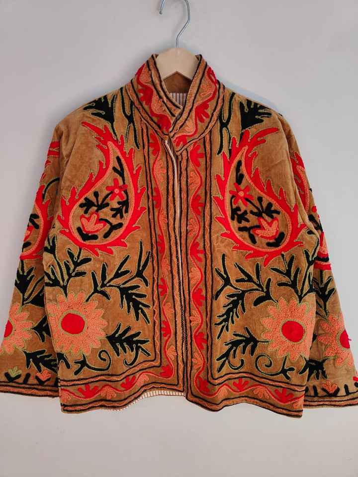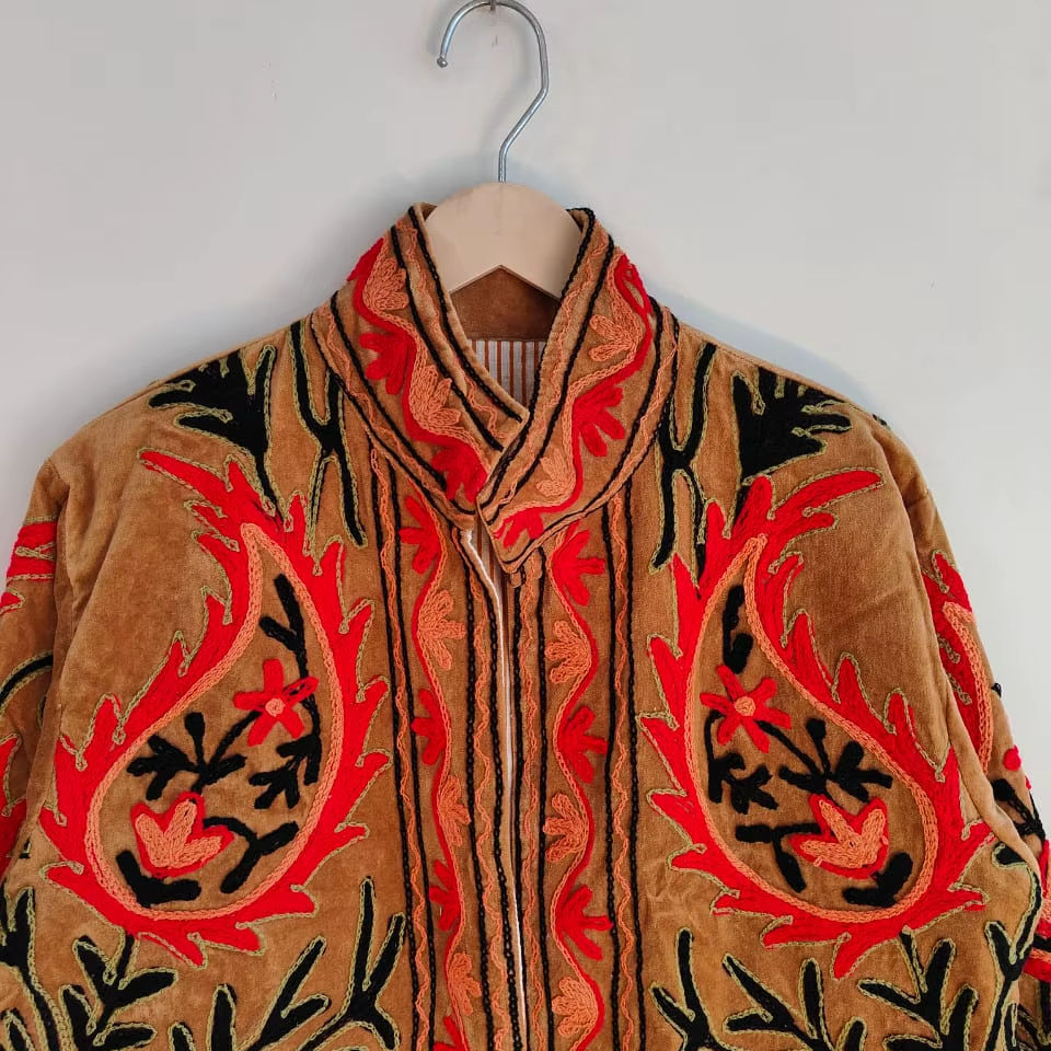 Chaqueta Suzani de Terciopelo Bohemia, Abrigo Floral Bordado a Mano, Prenda Exterior Tribal Vintage Boho, Chaqueta con Bordado Uzbeco Artístico