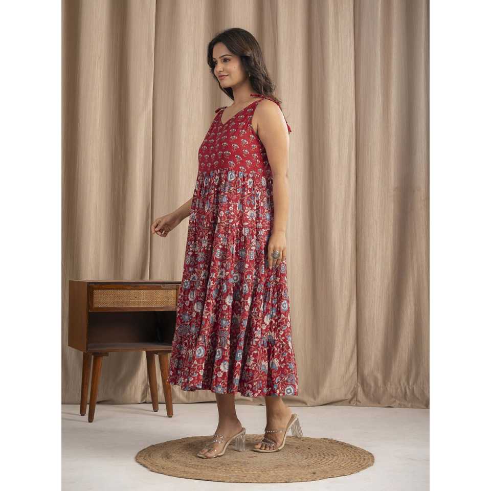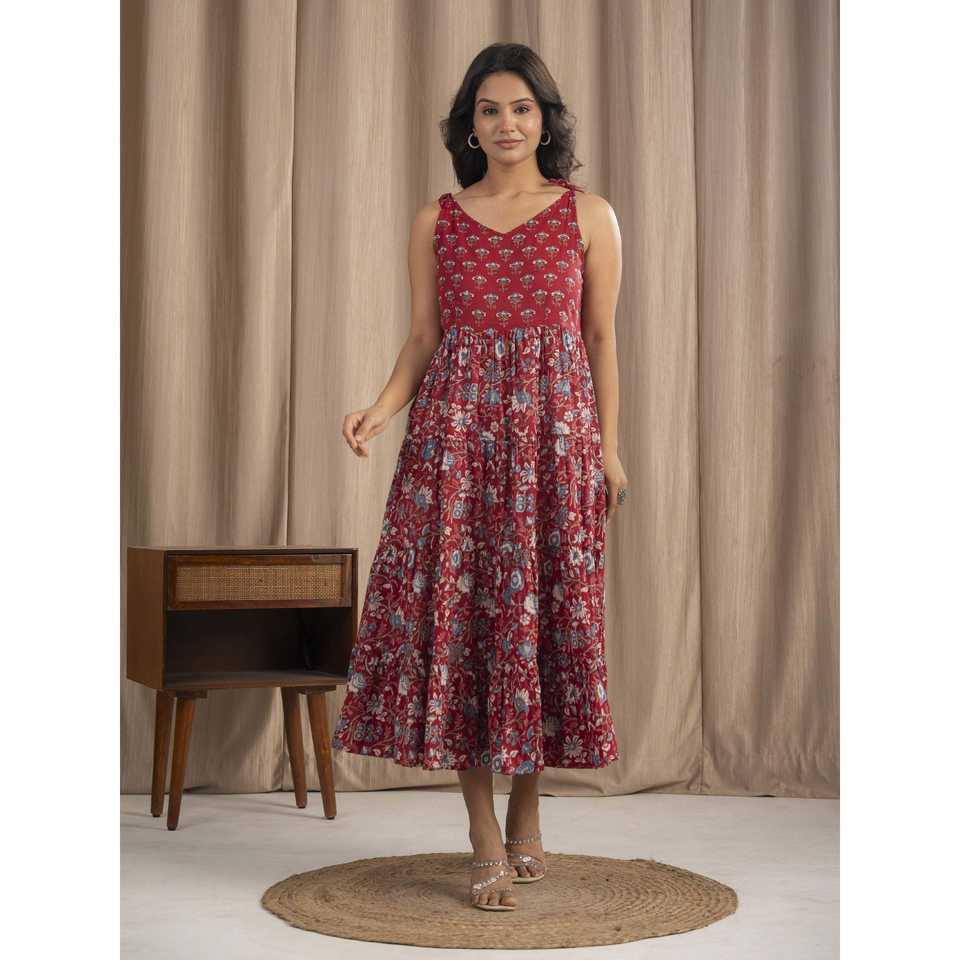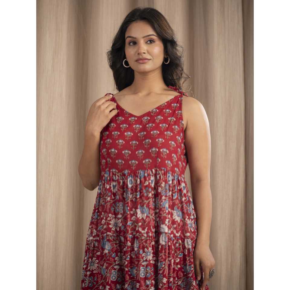 Vestido Boho Chic de Algodón Mulmul con Estampado a Mano, Color Granate, Tirantes Ajustables, Tallas XS-XXL, Transpirable, Cintura Natural, Ideal para Salir de Noche