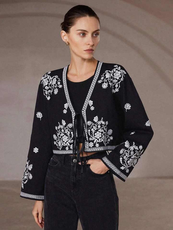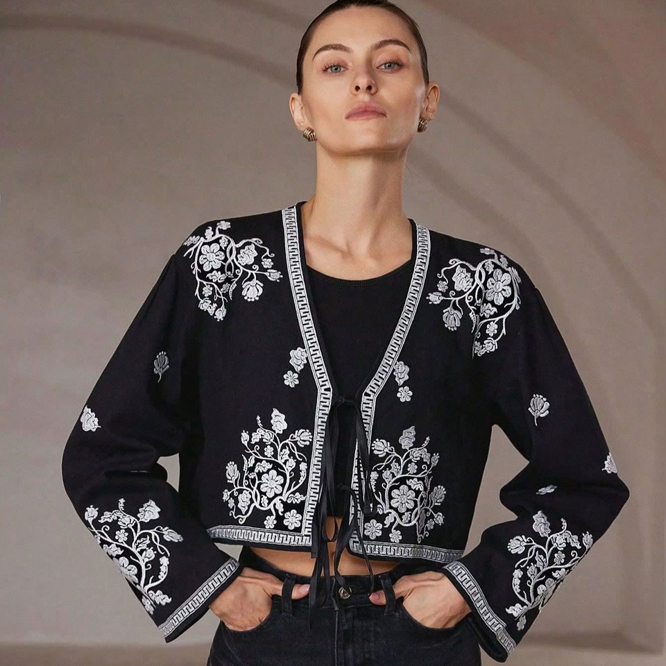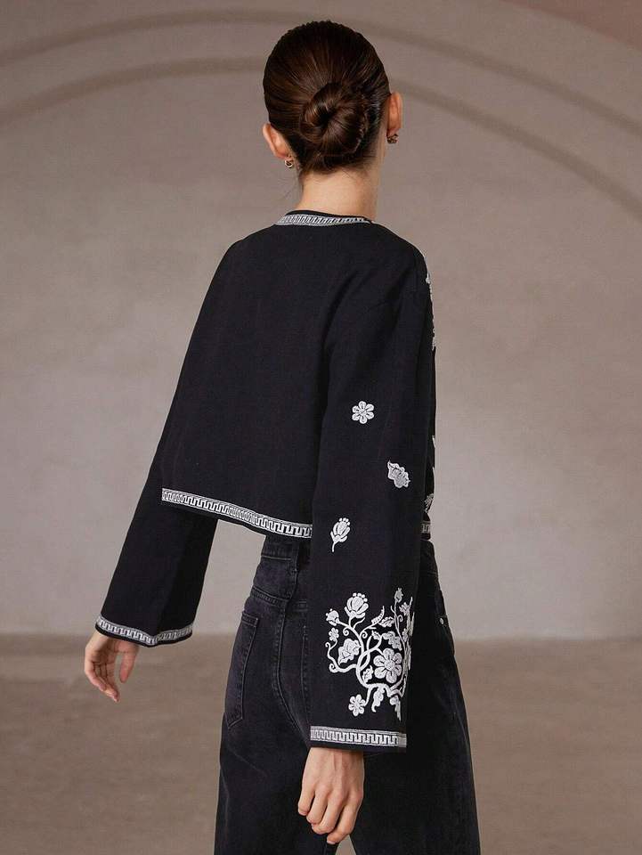 Chaqueta Kimono Corta Negra Acolchada con Botones y Bordado Suzani Estilo Boho Chic para Mujer, Talla XS, Otoño, Floral, Algodón Tejido, Lona Ecológica