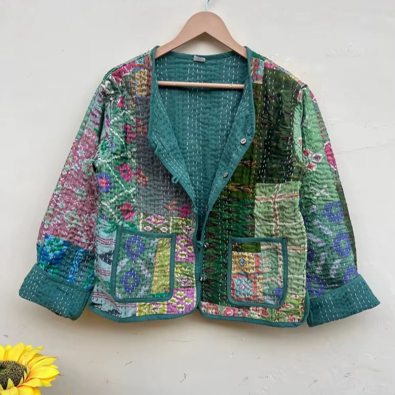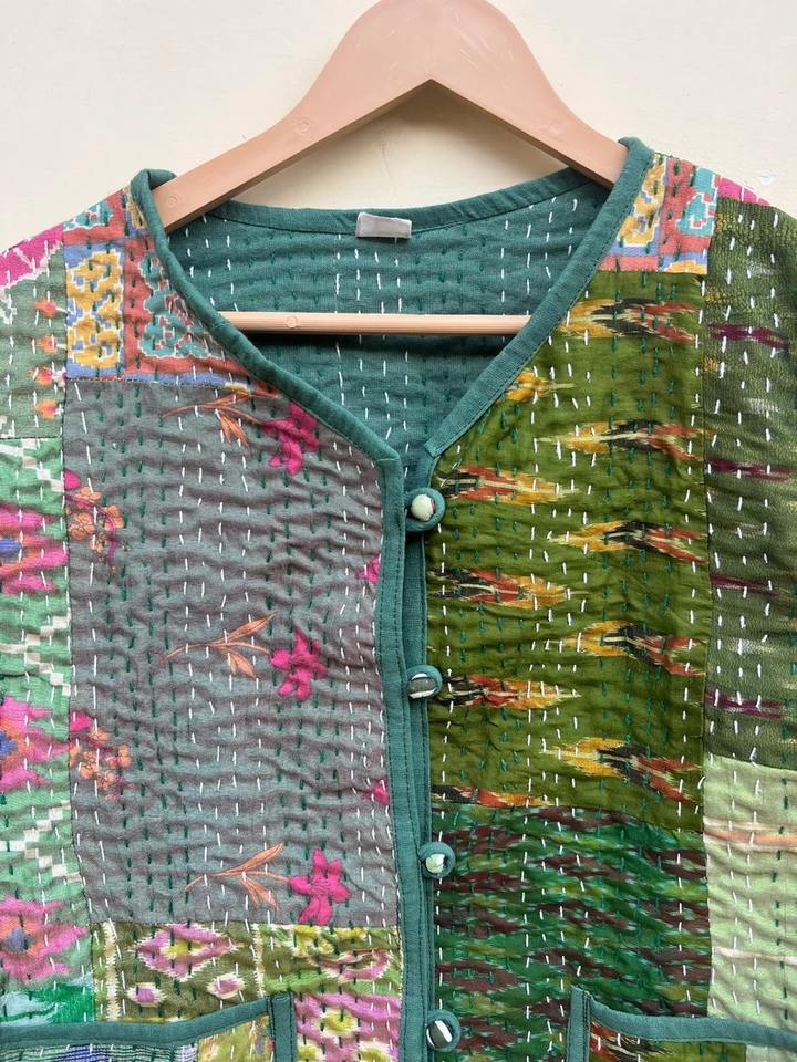 Boho Kantha Patchwork Floral Reversible Chaqueta acolchada de algodón Hecho a mano Bloque Estampado Abrigo de invierno Elegante Ropa de abrigo ligera
