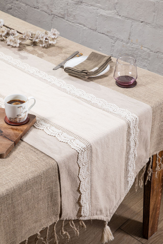 Camino de mesa de algodón de estilo simple para decoración del hogar rústico bohemio con bordes recortados con borlas de encaje en capas precio al por mayor