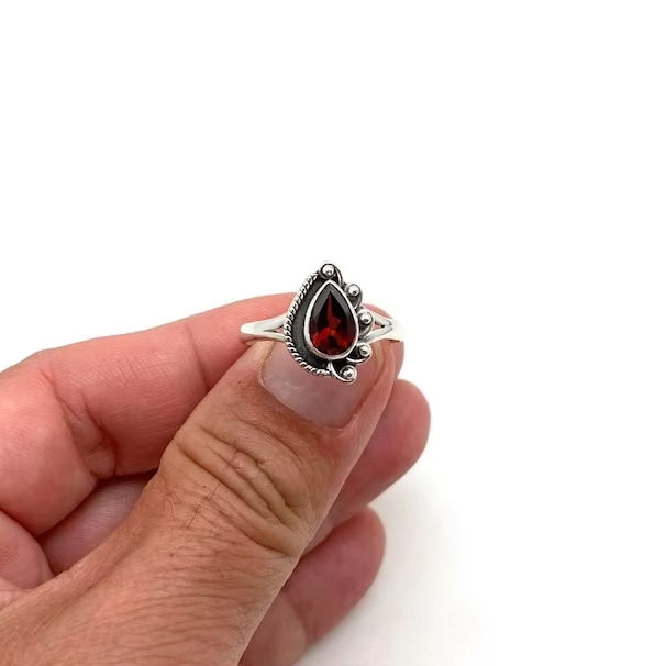 Anillo Hecho a Mano de Plata de Ley 925 con Baño de Rodio y Granate, Estilo Boho, para Mujer, Regalo para Fiesta o Boda