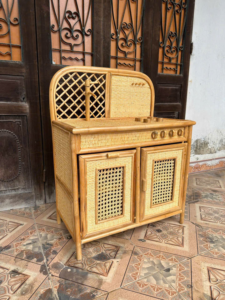 Gabinete de almacenamiento de ratán estilo bohemio con puertas dobles, detalles de bastón tejido y marco de madera para decoración del hogar